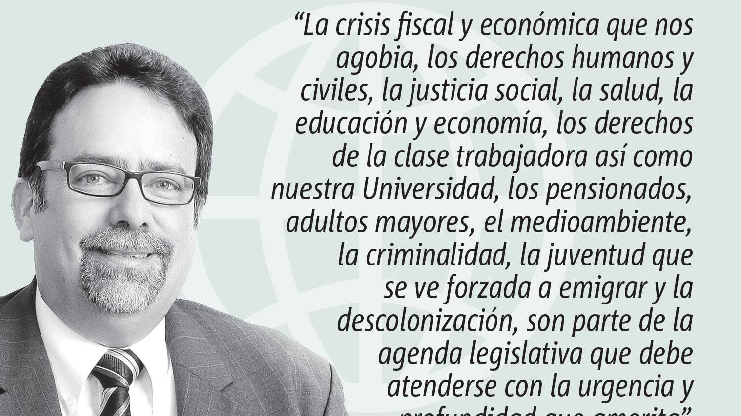 La crisis fiscal y económica que nos agobia, los derechos humanos y civiles, la justicia social, la salud, la educación y economía, los derechos de la clase trabajadora así como nuestra Universidad, los pensionados, adultos mayores, el medioambiente, la criminalidad, la juventud que se ve forzada a emigrar y la descolonización, son parte de la agenda legislativa que debe atenderse con la urgencia y profundidad que amerita.