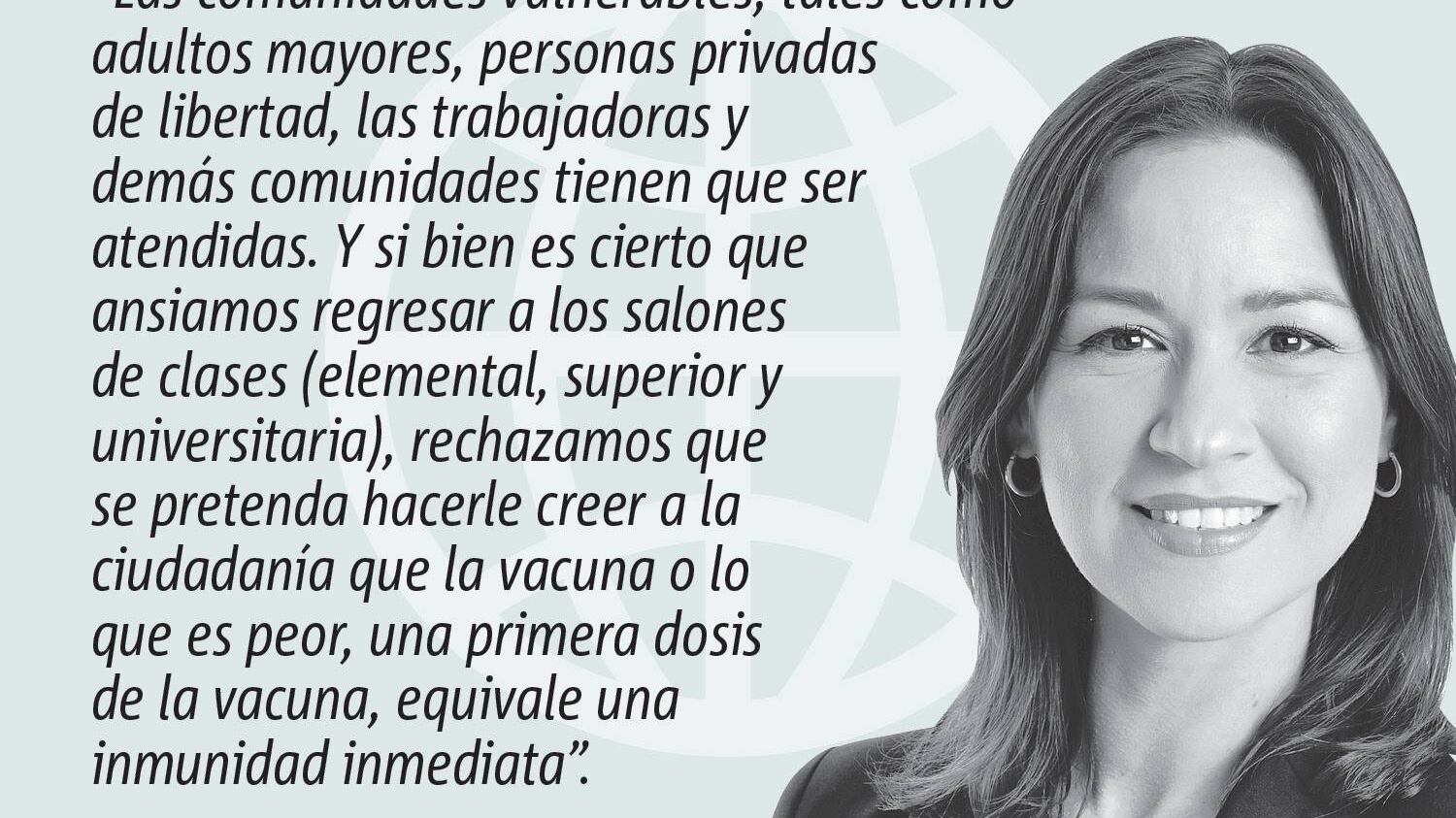 El pueblo necesita y exige que quienes gobiernen y dirijan agencias cumplan con sus deberes, con los protocolos y procedimientos establecidos y con las fases de vacunación anunciadas. Queremos superar esta crisis de Salud, salir del encierro y regresar a disfrutar de nuestras libertades. Ahora bien, no podemos alejarnos de la ciencia. Las comunidades vulnerables, tales como adultos mayores, personas privadas de libertad, las trabajadoras y demás comunidades tienen que ser atendidas. Y si bien es cierto que ansiamos regresar a los salones de clases (elemental, superior y universitaria), rechazamos que se pretenda hacerle creer a la ciudadanía que la vacuna o lo que es peor, una primera dosis de la vacuna, equivale una inmunidad inmediata. La respuesta a la pandemia tiene que ser colectiva y siempre basada en la ciencia.