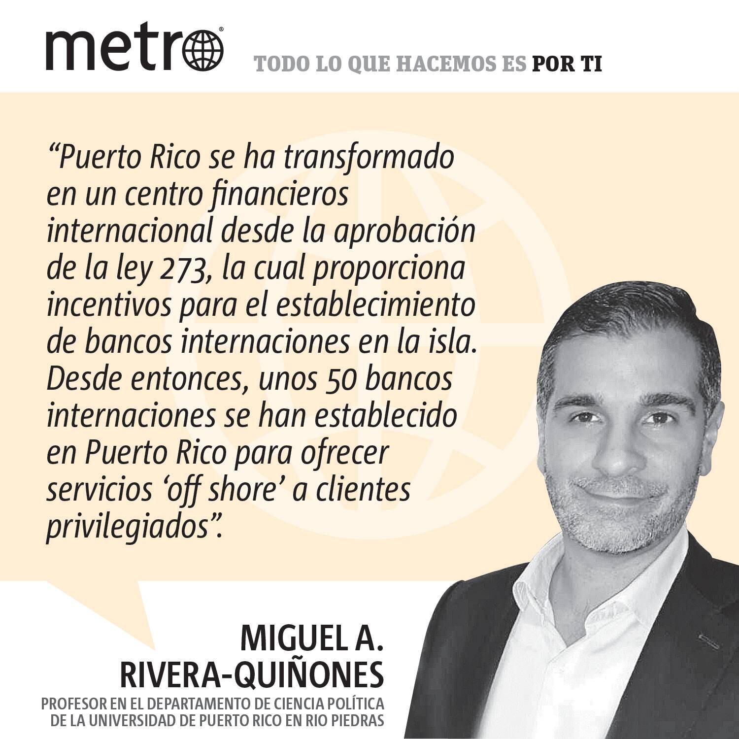 Puerto Rico se ha transformado en un centro financieros internacional desde la aprobación de la ley 273, la cual proporciona incentivos para el establecimiento de bancos internaciones en la isla. Desde entonces, unos 50 bancos internaciones se han establecido en Puerto Rico para ofrecer servicios ‘off shore’ a clientes privilegiados. Entre estos clientes privilegiados se encuentran los beneficiarios las leyes 20 y 22, los cuales están casi totalmente eximidos de pagar impuestos en Puerto Rico y Estados Unidos. Bajo estas leyes, los extranjeros que conviertan a Puerto Rico en su domicilio principal o las empresas foráneas que exporten servicios desde la isla, pagan menos de un 4% en impuestos. Estas tres leyes han conformado un régimen contributivo preferencial que viabiliza que significativos recursos financieros circulen por Puerto Rico para evadir impuestos. Según ‘Tax Justice Network’, 40% de los flujos financieros que pasan por Puerto Rico se originan o se destinan a las Islas Caimanes. Que no solo es de los paraísos fiscales más grandes del mundo, si no que también es el preferido por los Fondos de Cobertura de Wall Street.