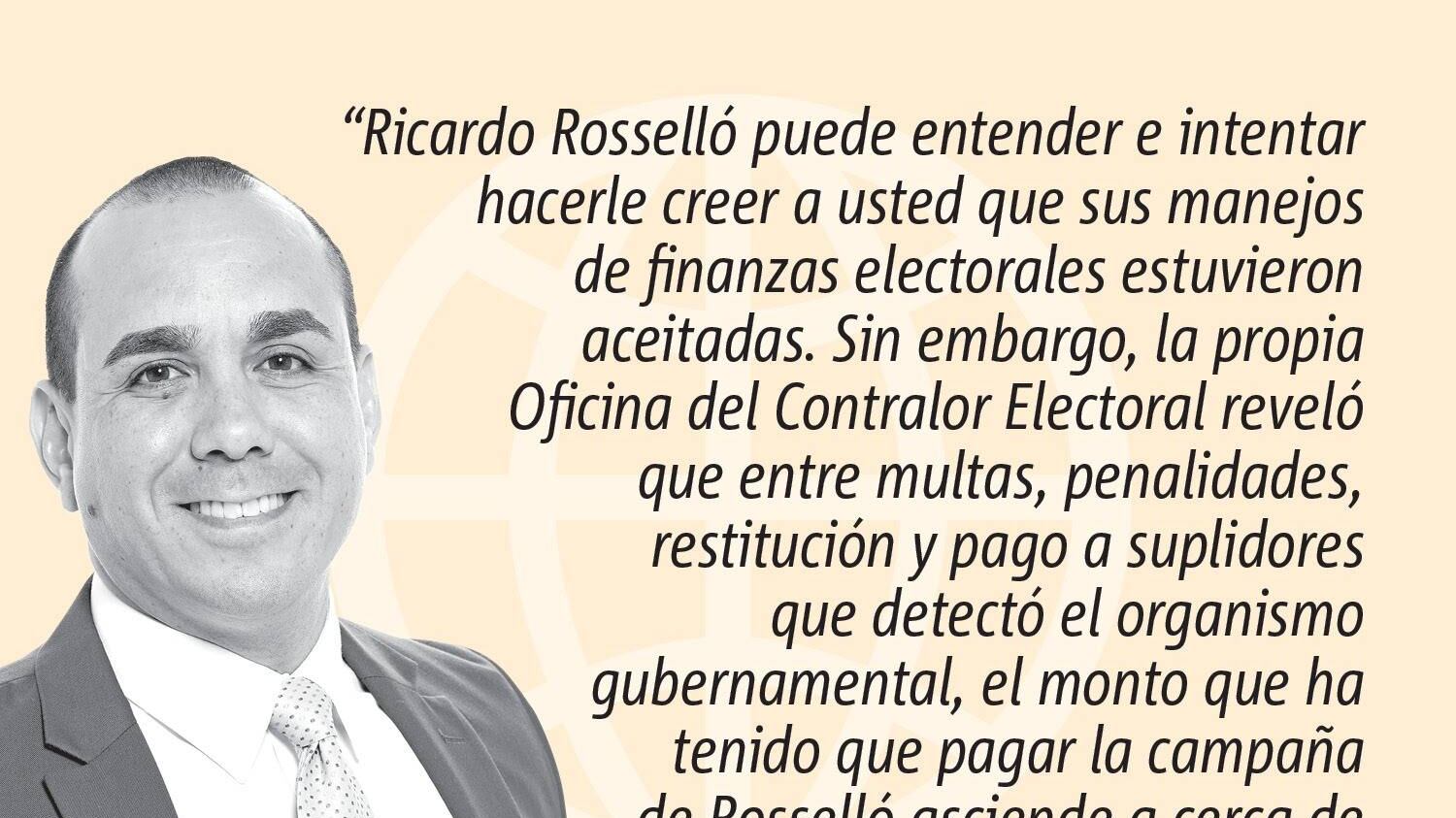 El gobernador Ricardo Rosselló puede entender e intentar hacerle creer a usted que sus manejos de finanzas electorales estuvieron aceitadas. Sin embargo, la propia Oficina del Contralor Electoral reveló que entre multas, penalidades, restitución y pago a suplidores que detectó el organismo gubernamental, el monto que ha tenido que pagar la campaña de Rosselló asciende a cerca de 1.2 millones de dólares. Ese ese aspecto, la campaña, más que aceitada, parecía correr con aceite barato o alterado.