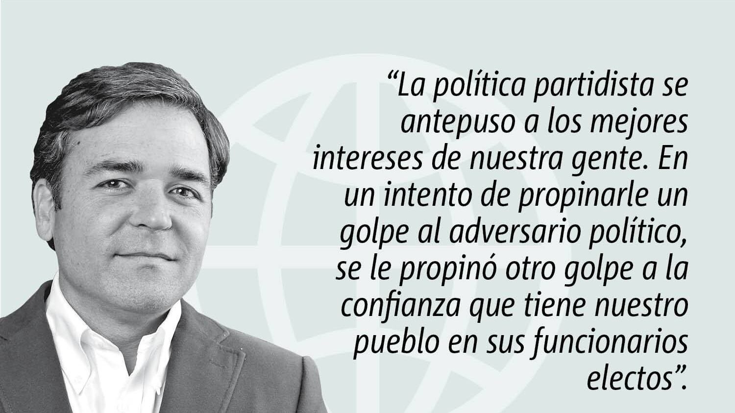 Nuevamente la política partidista se antepuso a los mejores intereses de nuestra gente. En un intento de propinarle un golpe al adversario político se le propinó otro golpe más a la confianza que tiene nuestro pueblo en sus funcionarios electos. Ante esa realidad, de nuestra parte solo podemos recordarles a aquellos que hoy ocupan posiciones electas y, por ende, tienen el poder, jamás deben olvidar que el poder sin la confianza del pueblo no es nada.