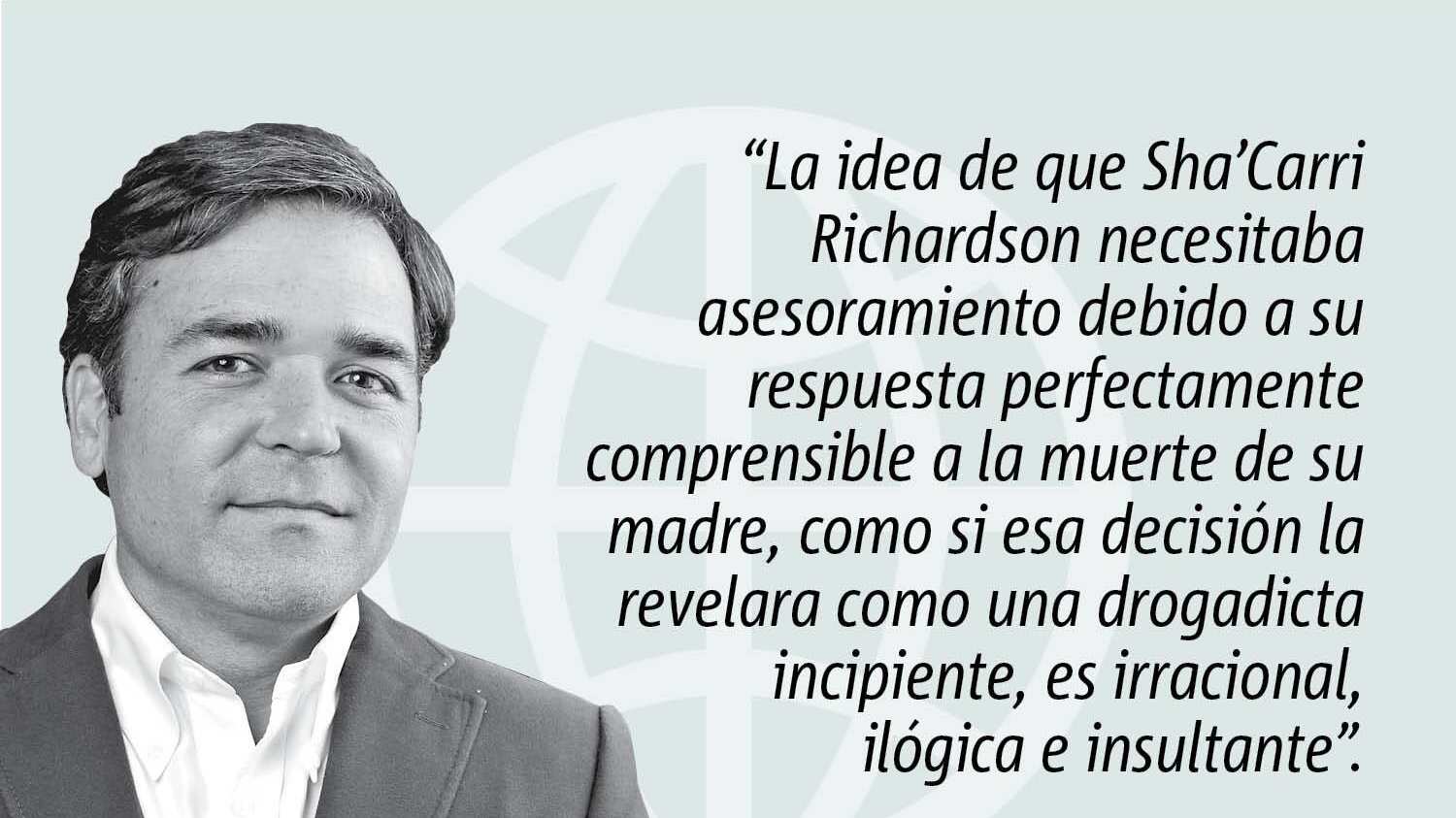La USADA dijo que la suspensión de Richardson se redujo de tres meses a uno porque su uso de cannabis ocurrió fuera de la competencia y no estaba relacionado con el rendimiento deportivo, y porque completó con éxito un programa de asesoramiento sobre su uso de cannabis. La idea de que Richardson necesitaba asesoramiento debido a su respuesta perfectamente comprensible a la muerte de su madre, como si esa decisión la revelara como una drogadicta incipiente, es irracional, ilógica e insultante.