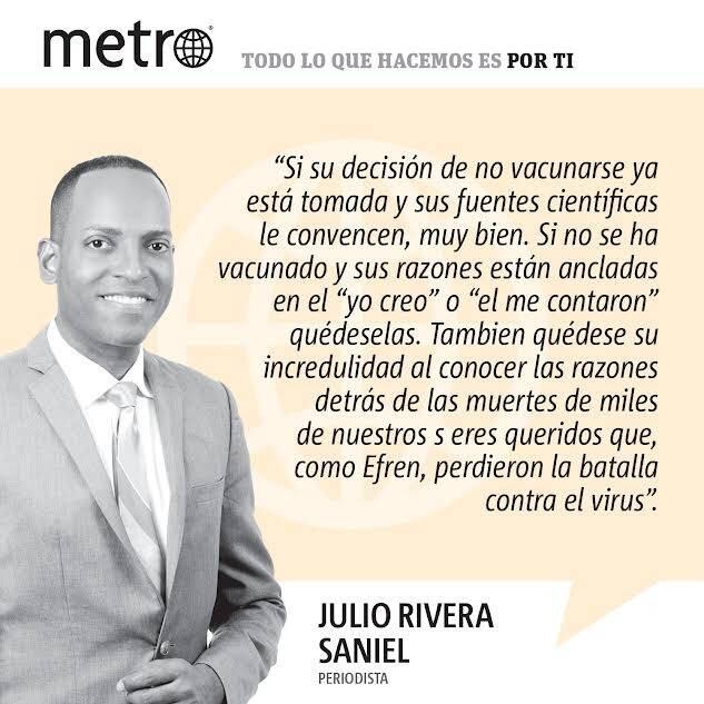 Si su decisión de no vacunarse ya está tomada y sus fuentes científicas le convencen, muy bien. Si no se ha vacunado y sus razones están ancladas en el “yo creo” o “el me contaron” quédeselas. Tambien quédese su incredulidad al conocer las razones detrás de las muertes de miles de nuestros s eres queridos que, como Efren, perdieron la batalla contra el virus. Pero por favor no intente borrar la realidad con la única intención de querer justificar sus posturas antes falta de argumentos propios.
