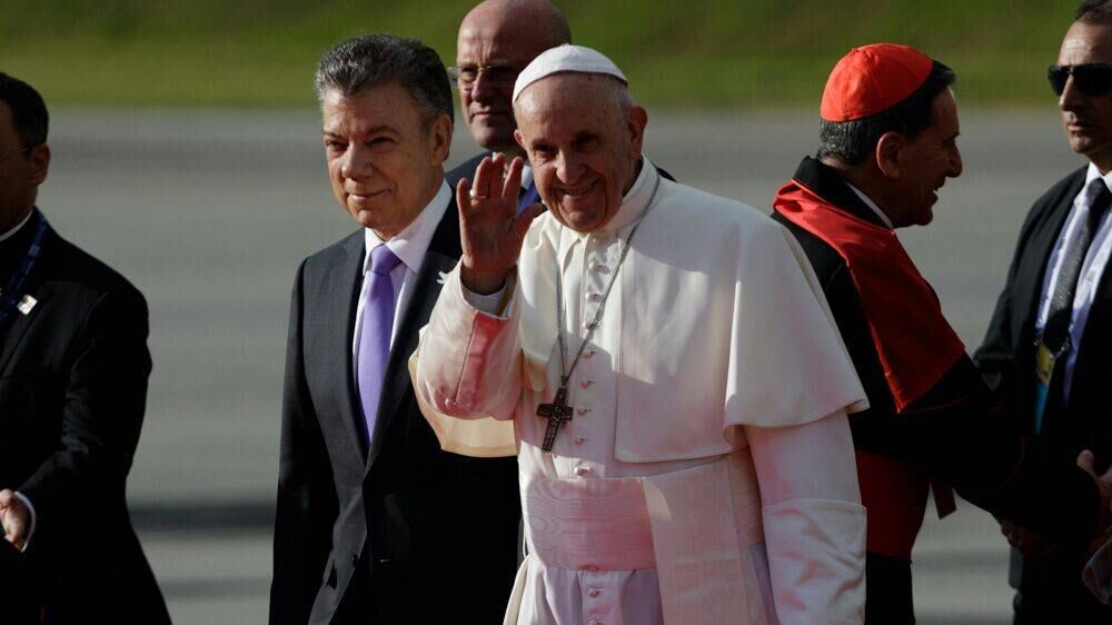 La llegada del papa Francisco a Bogotá fue alegre y sin mucho protocolo. A pesar de la organización protocolaria que había para su arribo, el sumo pontífice decidió no seguirlos y acercarse a los colombianos que estaban esperándolo en CATAM.
