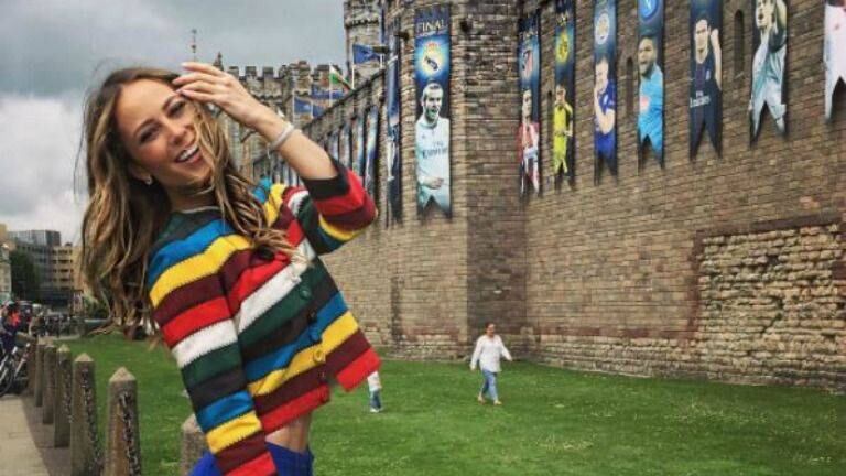 La hermosa presentadora se encontraba por las calles de la ciudad galesa cuando de pronto fue interrumpida por un aficionado del conjunto merengue, quien le plantó un beso en la mejilla.
