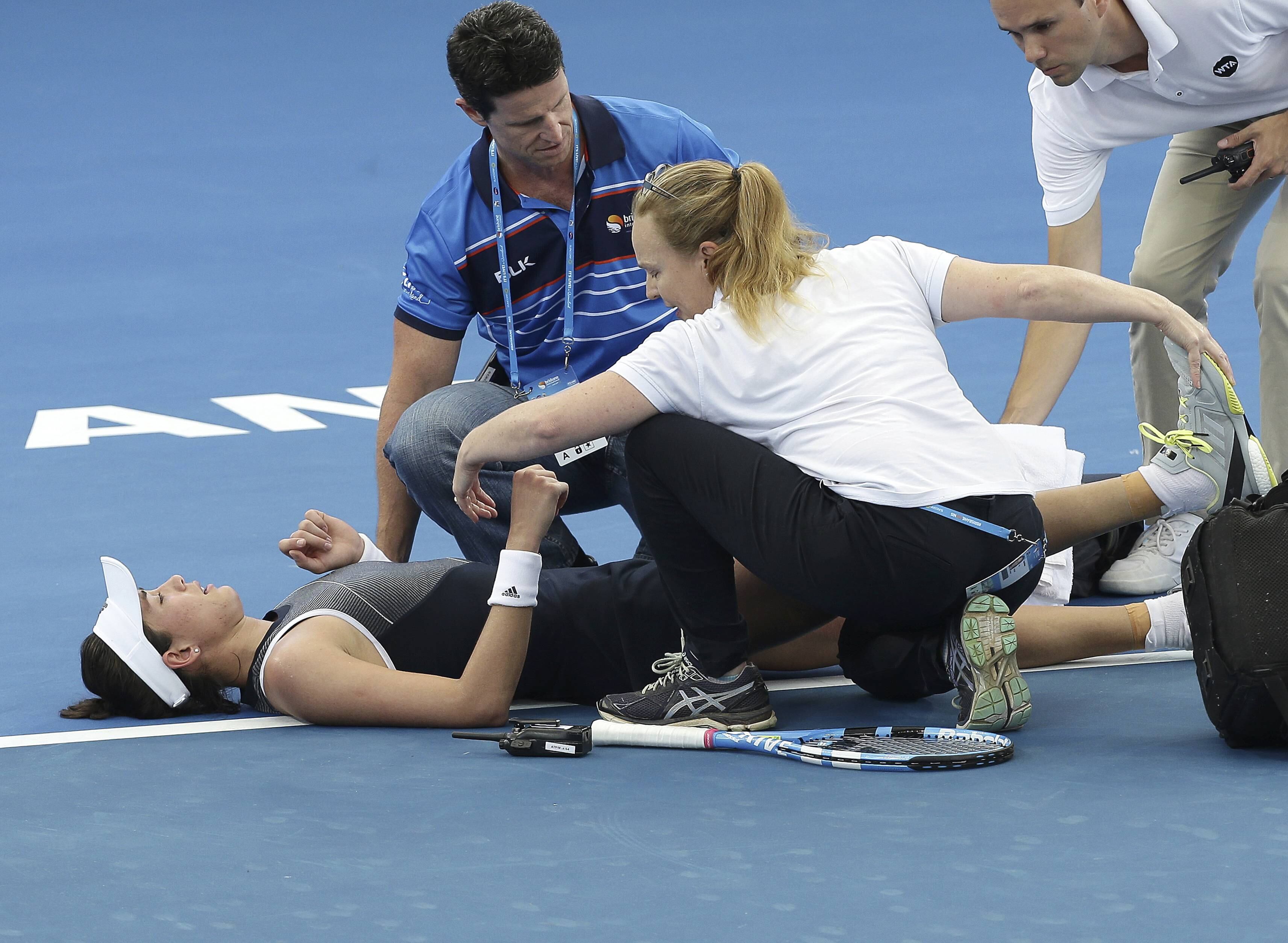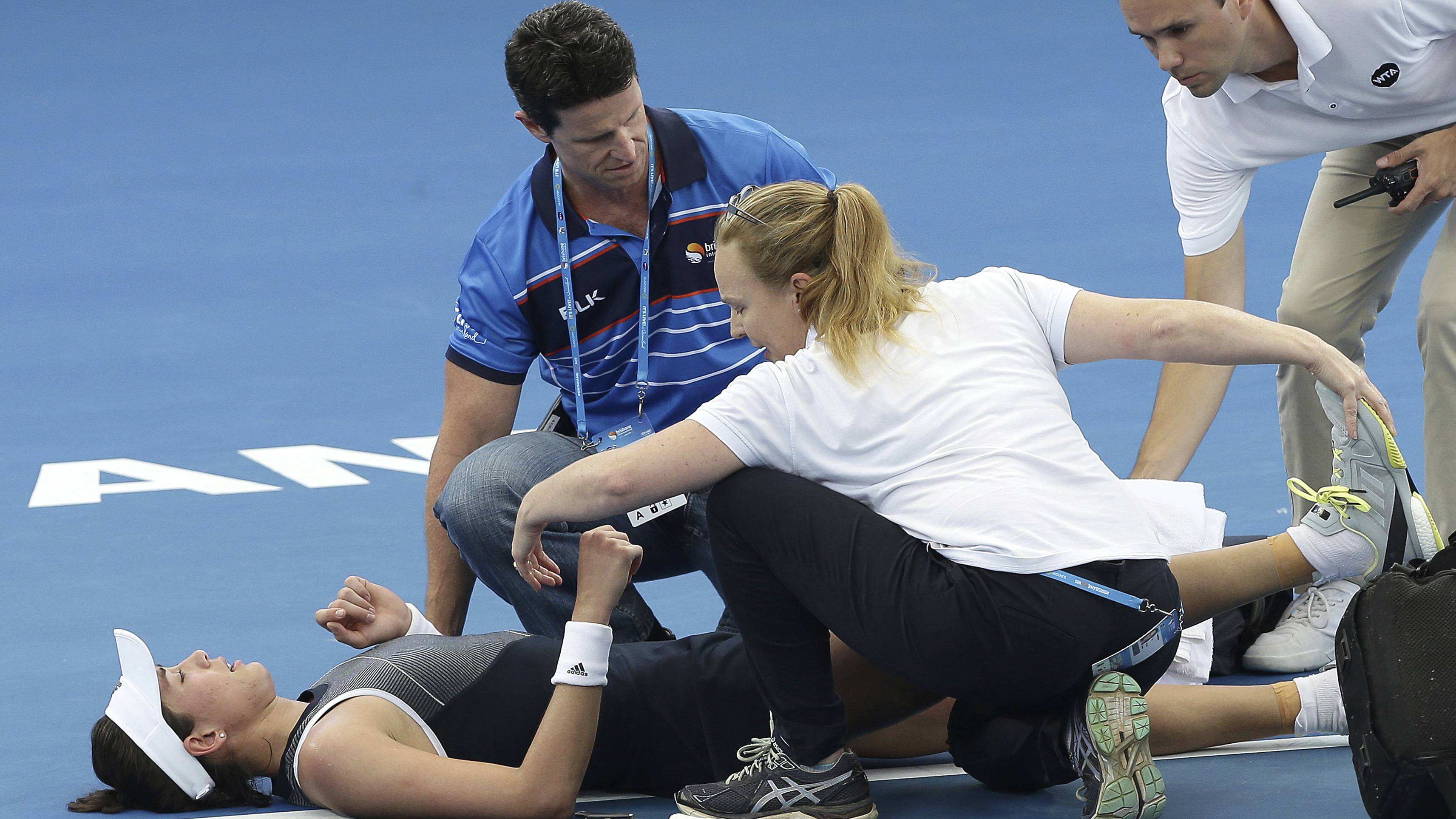 BRISBANE, Australia — La primera cabeza de serie Garbiñe Muguruza se desplomó a la cancha en el tercer set antes de abandonar su primer partido en el torneo de Brisbane por calambres en las piernas.