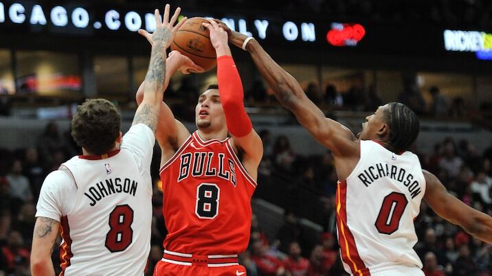 Zach LaVine anotó 18 puntos en lo que fue apenas su segundo partido con los Bulls de Chicago, que vencieron el lunes 119-111 al Heat de Miami para cortarle una racha de siete triunfos consecutivos.