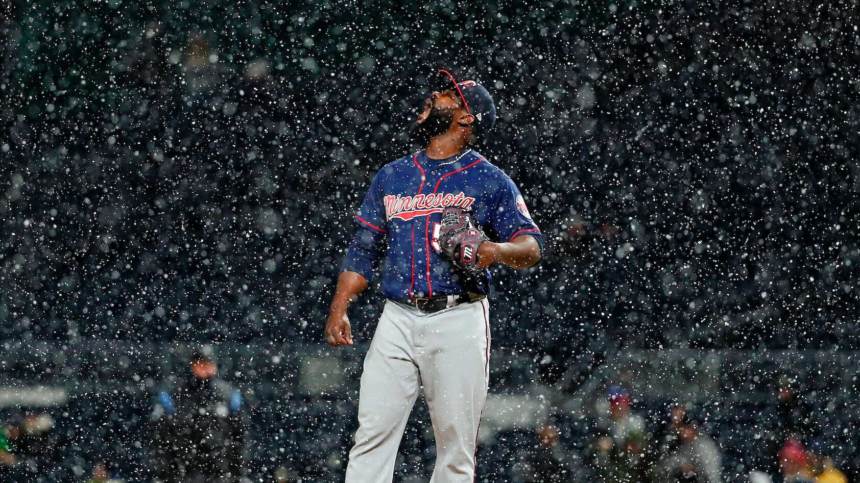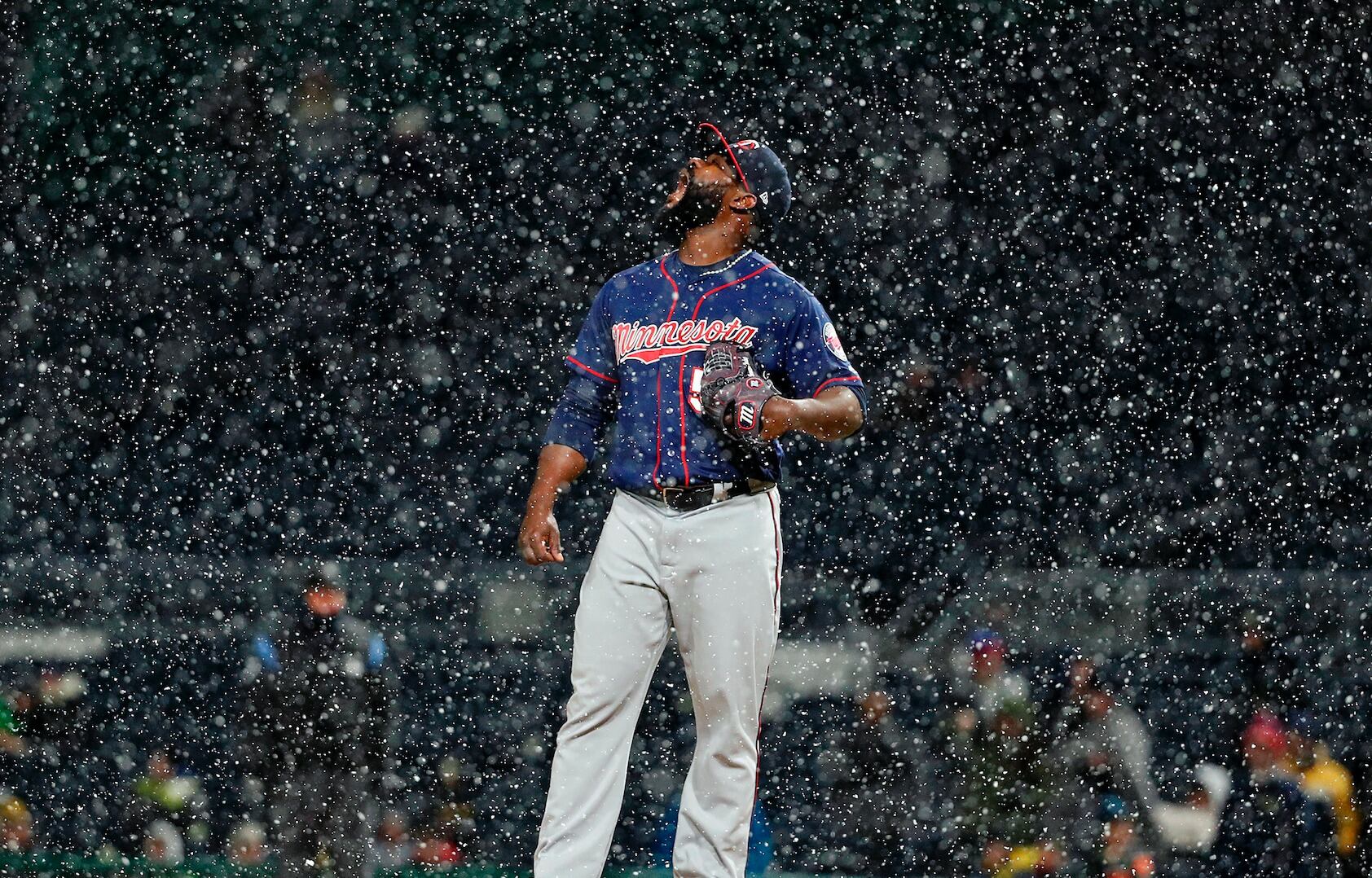 Al cerrador dominicano de los Mellizos Fernando Rodney le tocó sellar una victoria 7-3. En un momento, se inclinó para atrapar copos de nieve con su boca.