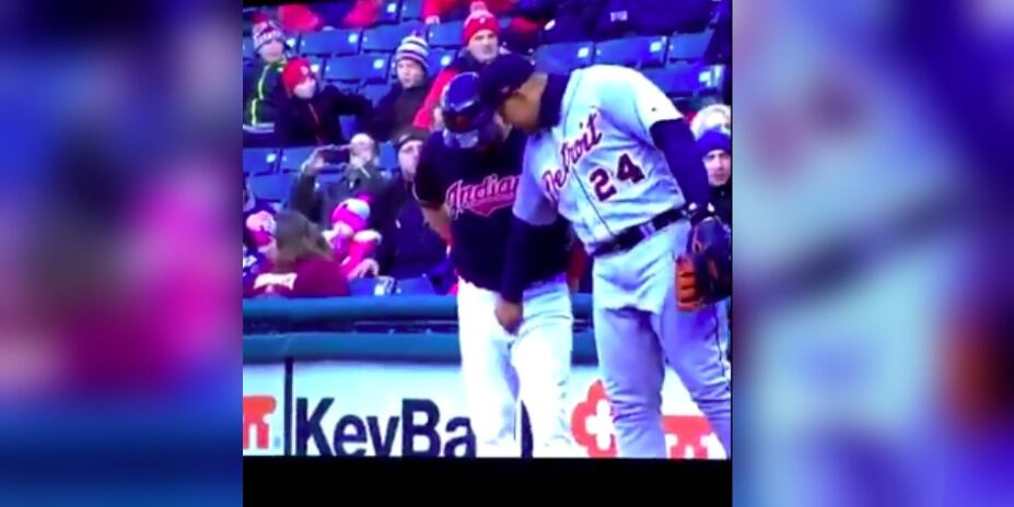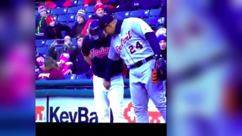 Miguel Cabrera, primera base de los Tigres de Detroit fue captado ’toqueteando’ a su rival Jason Kipnis durante el partido ante los Cleveland Indians.