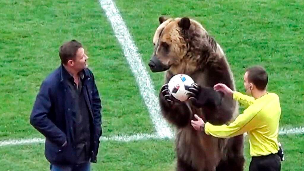 El espectáculo ocurrió el sábado antes de un partido de tercera división en la ciudad de Pyatigorsk. Imágenes televisivas mostraron al animal cuando era llevado al terreno del estadio del club Mashuk-KMV, ante aplausos de los espectadores. El oso, llamado Tima, llevó al balón y se lo entregó al árbitro principal.