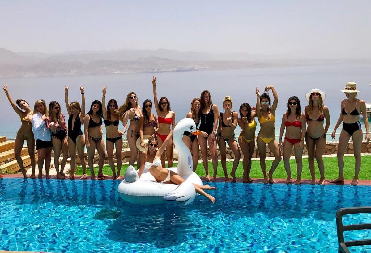 La también diseñadora viajó con un grupo de amigas a Eilat, en Asia, donde celebró su última fiesta como soltera en en una piscina situada en las costas del Golfo de Aqaba, mientras presumieron sus esculturales cuerpos.