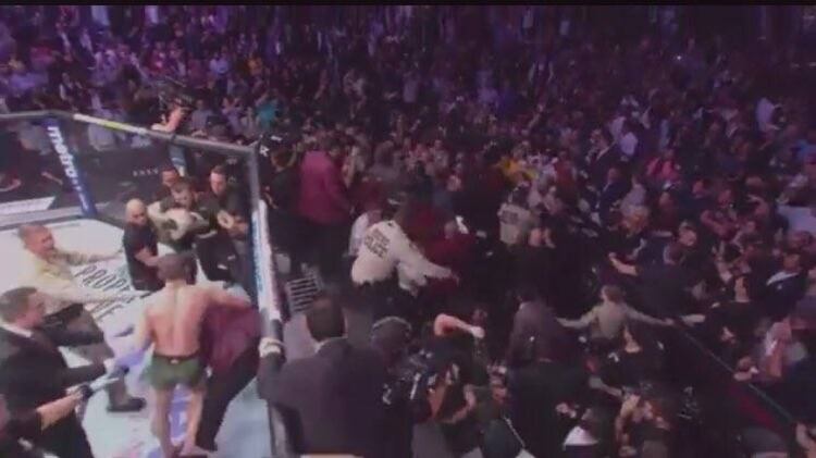 El caos estalló luego que McGregor (21-4) no pudo zafarse cuando Nurmagomedov (27-0) lo agarró del cuello. Seguidamente Nurmagomedov dejó en la lona a McGregor y alzó un dedo acusador contra la esquina del irlandés, gritando y tirándoles su protector bucal.