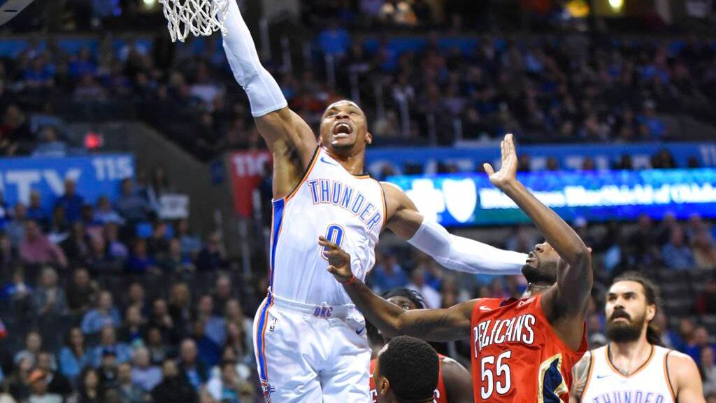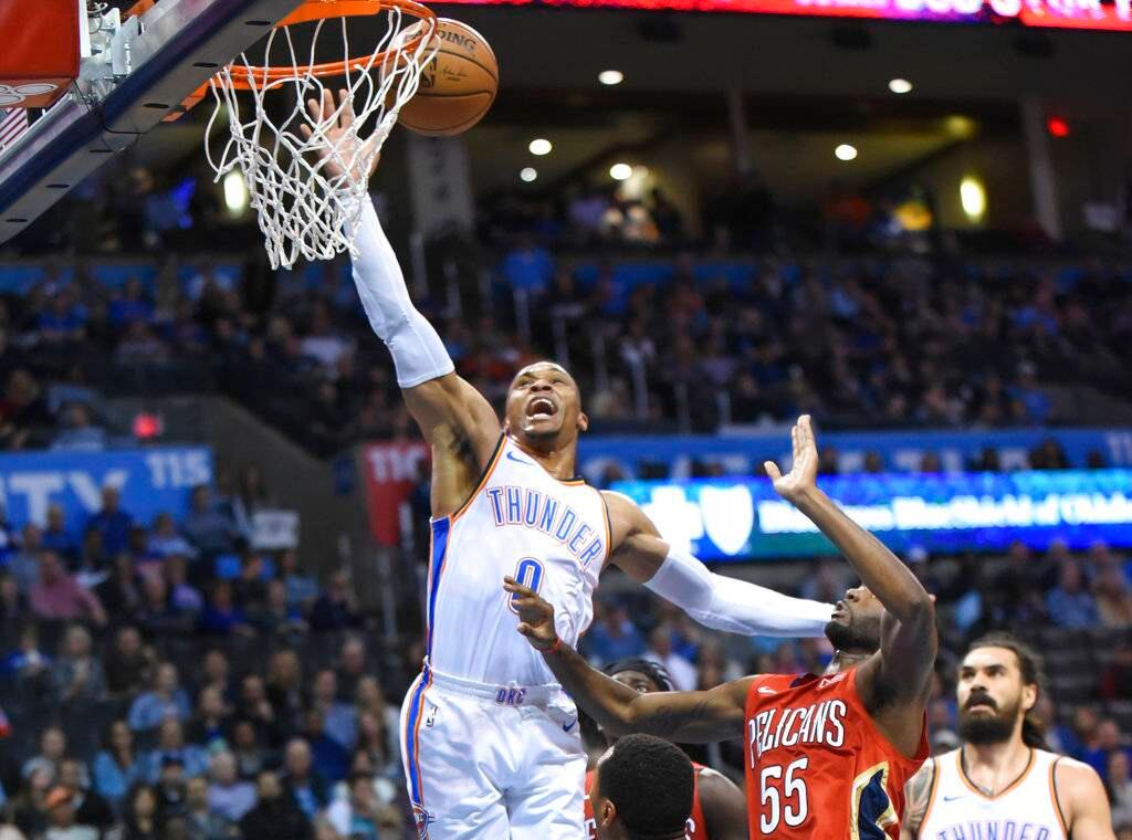 El Thunder encadenó su quinta victoria al vencer 122-116 a los Pelicans de Nueva Orleáns el lunes, pero perdió a Westbrook en el tercer cuarto. Tras caer mal con el pie, Westbrook pateó el piso en frustración de salir cojeando de la cancha. Acabó con 17 puntos, nueve asistencias y siete rebotes.