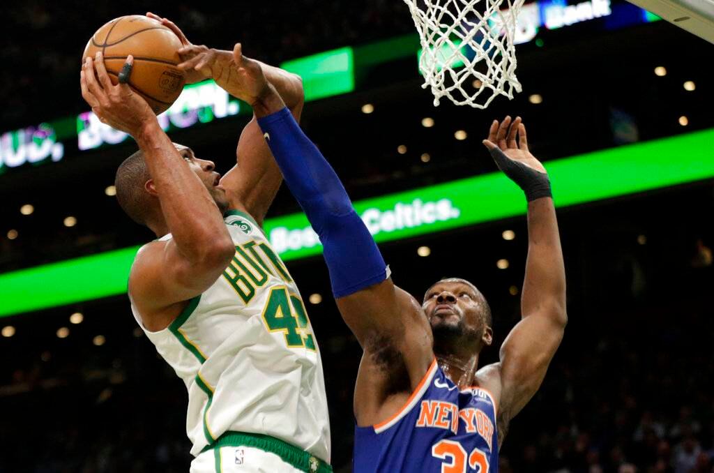 Kyrie Irving anotó 22 puntos antes de abandonar el partido en los minutos finales por problemas de hombro derecho, el dominicano Al Horford sumó 19 tantos y 12 rebotes, y los Celtics de Boston arrasaron el jueves por 128-100 con los Knicks de Nueva York.