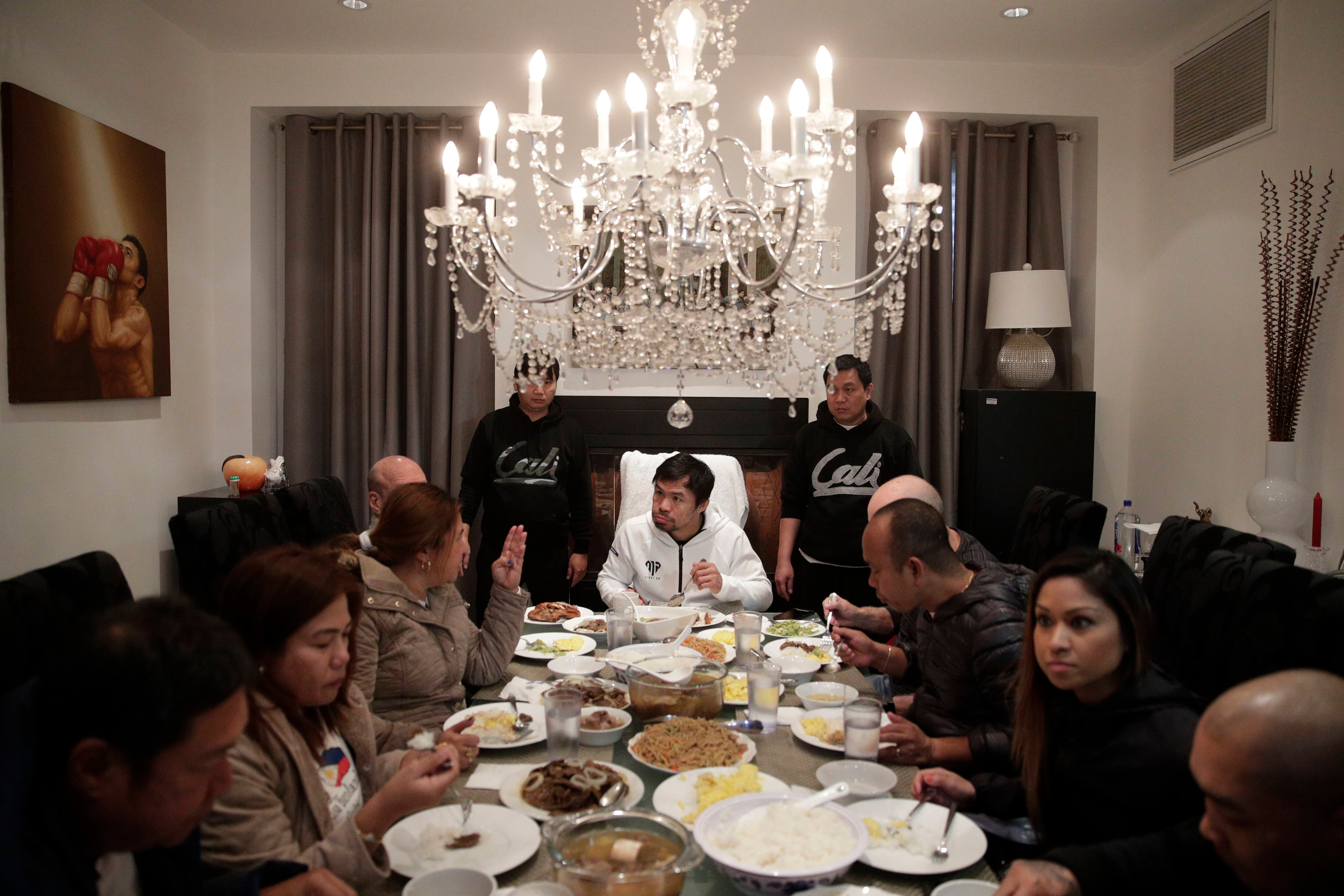 El desayuno en la casa de Manny Pacquiao comenzó con oraciones en silencio, seguido de más silencio alrededor de la enorme mesa de cenar, con el numeroso séquito del púgil esperando a que este tomase el primero bocado.