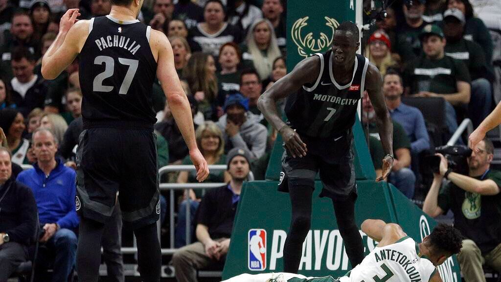 Giannis Antetokounmpo corrió por la cancha e hizo clavada tras clavada hasta que los Pistons acabaron empujándole al suelo.