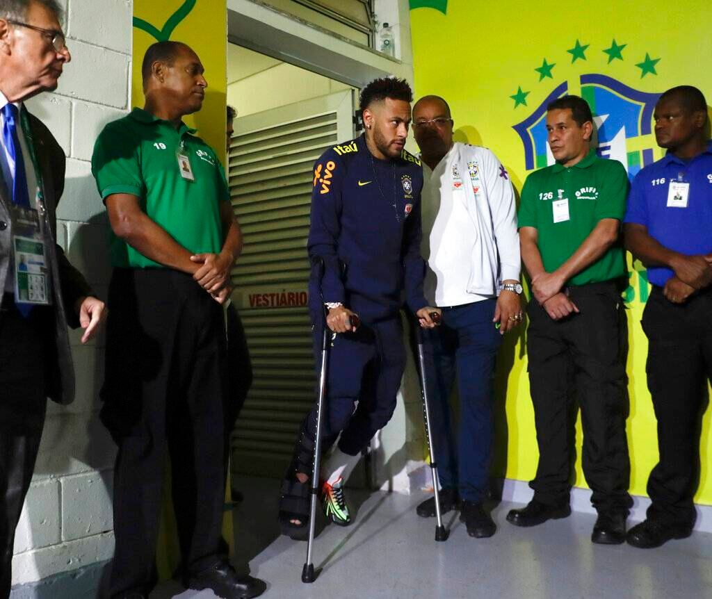 Neymar abandonó con muletas el estadio al inicio del segundo tiempo y se trasladó a un hospital de la capital brasileña en compañía de su padre, de Edú Gaspar y del médico Kalil.