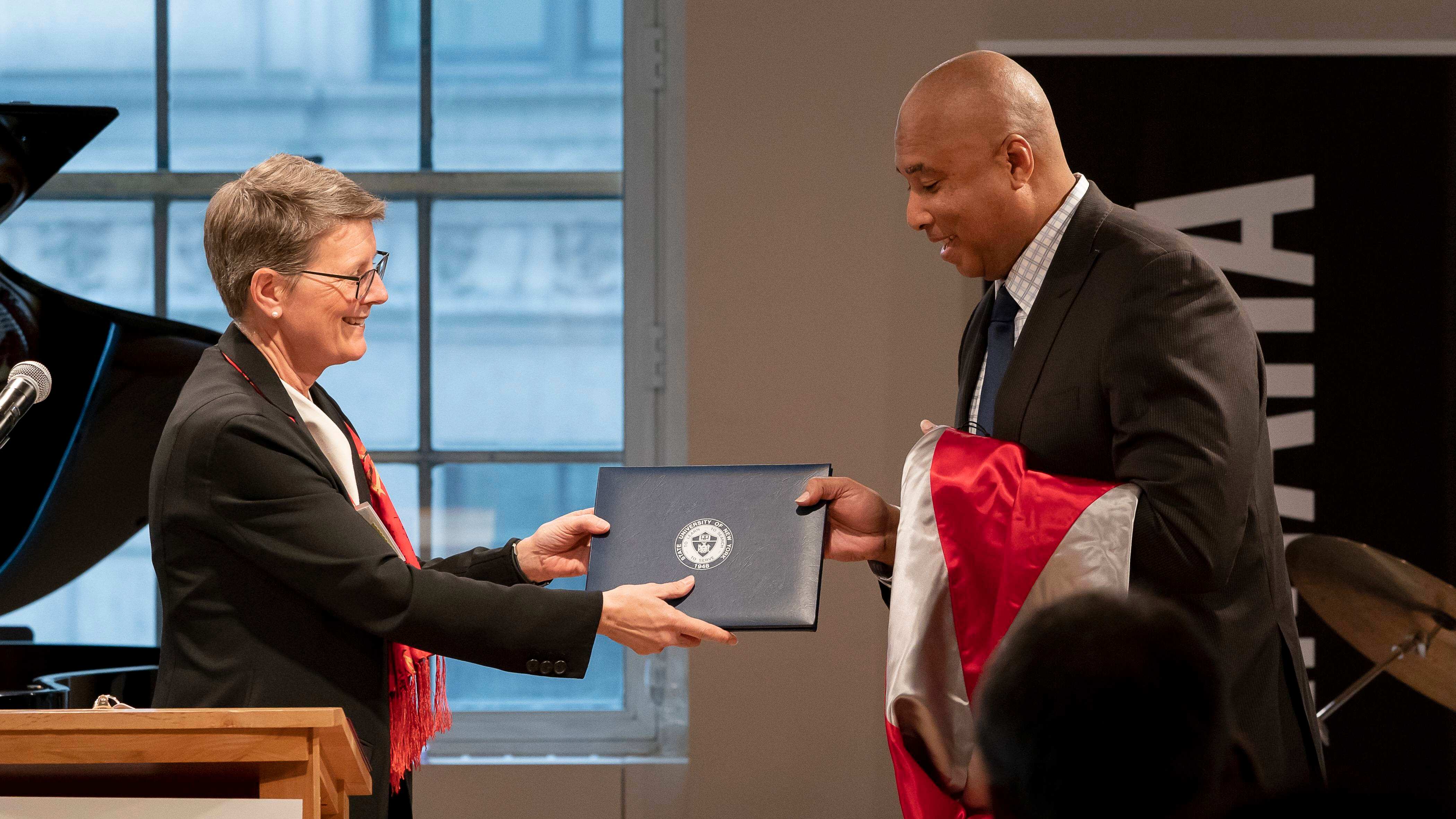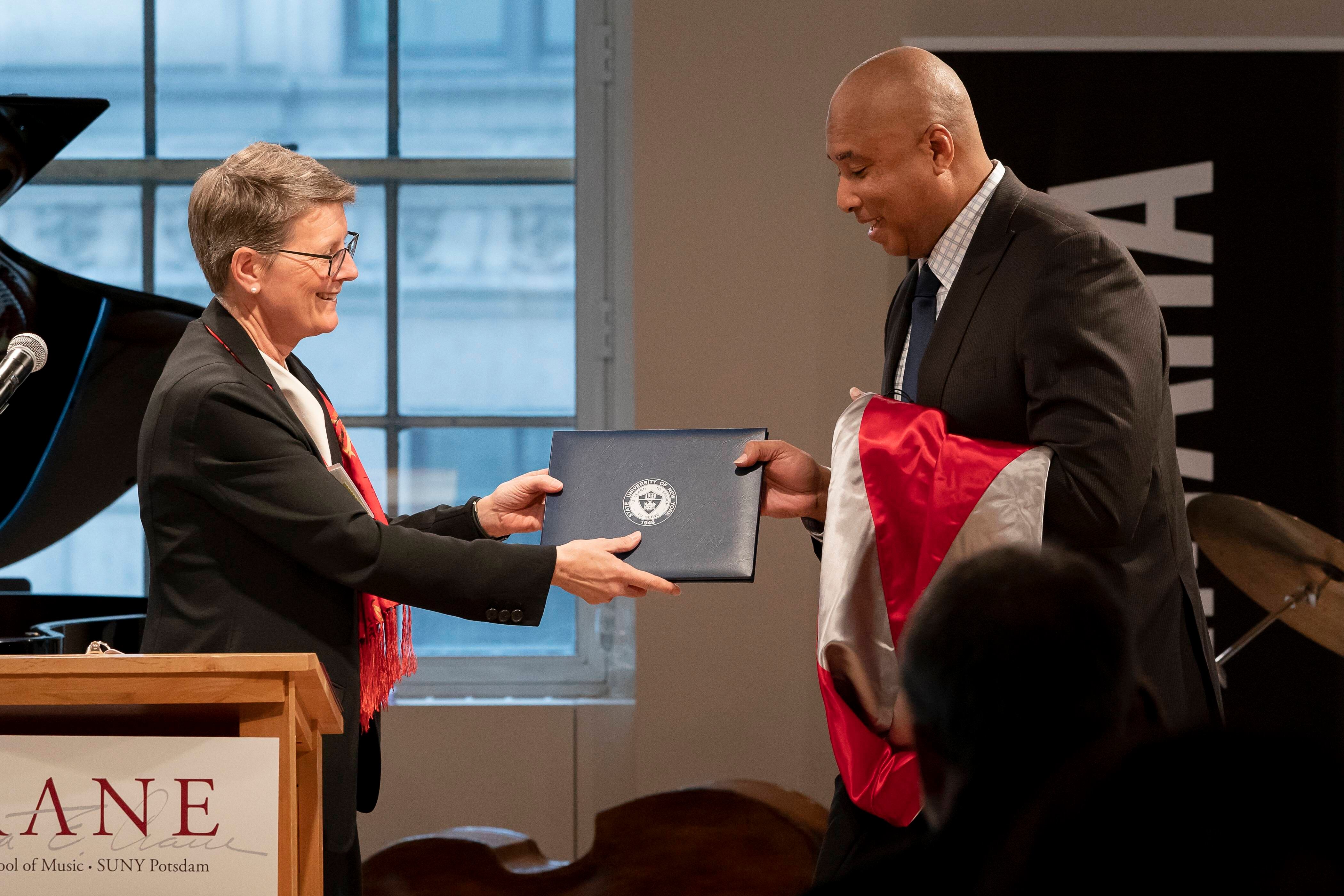 La presidenta de SUNY Potsdam, la doctora Kristin Esterberg, y el director del Crane School of Music, el doctor Michael Sitton, presentaron la distinción a Bernie Williams, quien estuvo acompañado de amigos y familiares. “En Crane School of Music de SUNY Potsdam compartimos tanto el amor hacia la música como la dedicación hacia la educación musical delseñor Williams, quien representa los ideales a los que aspiramos como artistas y educadores”, expresaron los directivos en comunicación escrita.