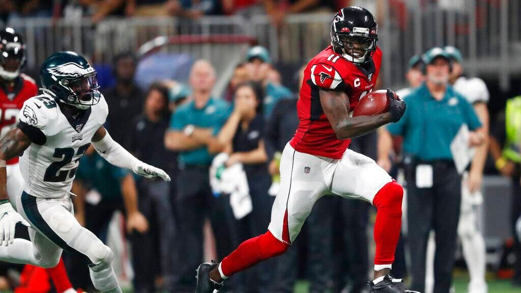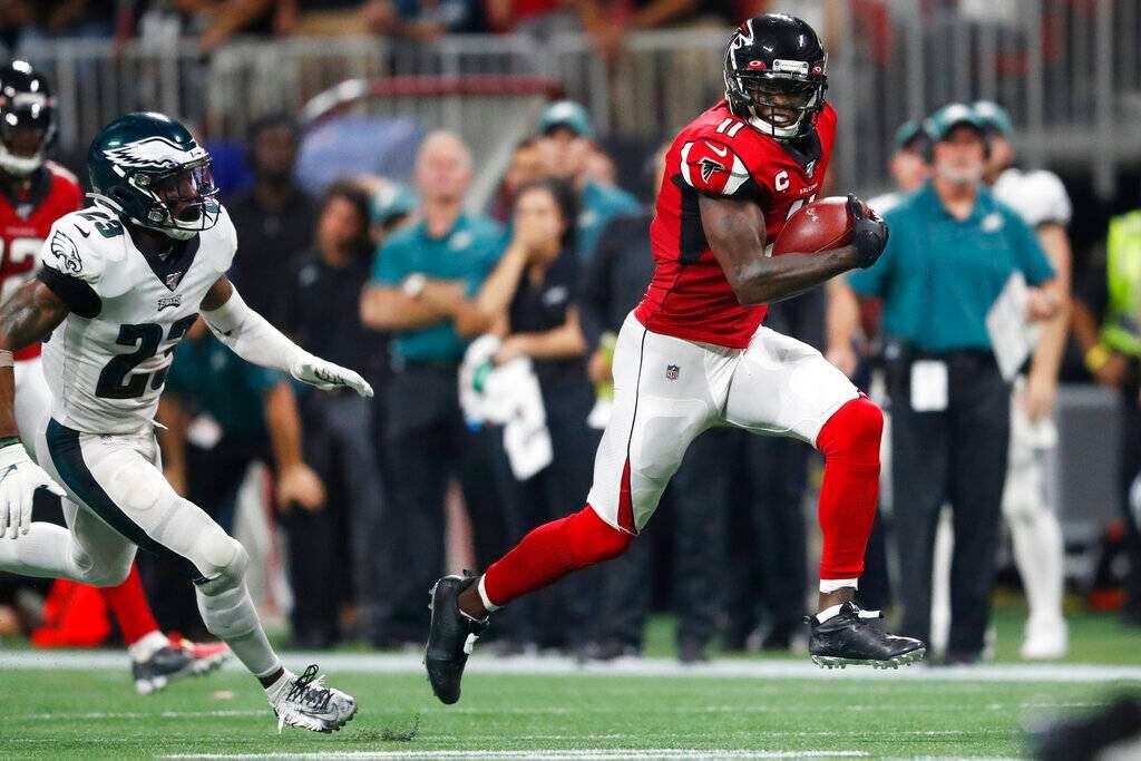 Julio Jones atrapó un pase corto y lo llevó 54 yardas hasta el final de la cancha cuando quedaban 2:10 minutos por disputar, dando una victoria 24-20 el domingo a los Falcons de Atlanta sobre los Eagles de Filadelfia.