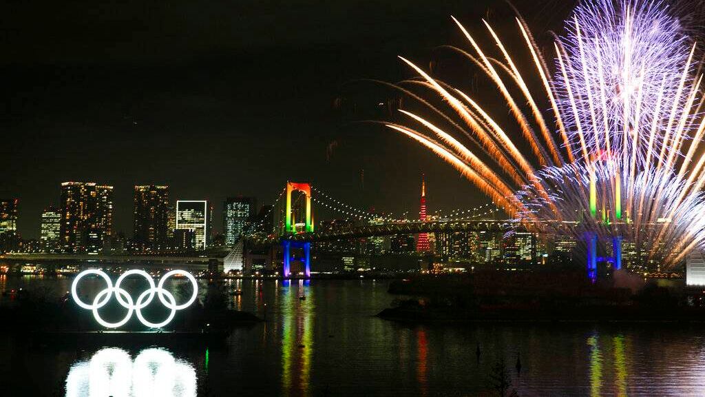 El espectáculo se llevó a cabo en el cielo sobre una barcaza atracada en la Bahía de Tokio que tenía sobre ella una enorme réplica de los cinco anillos olímpicos, un recordatorio de que los Juegos están cerca.