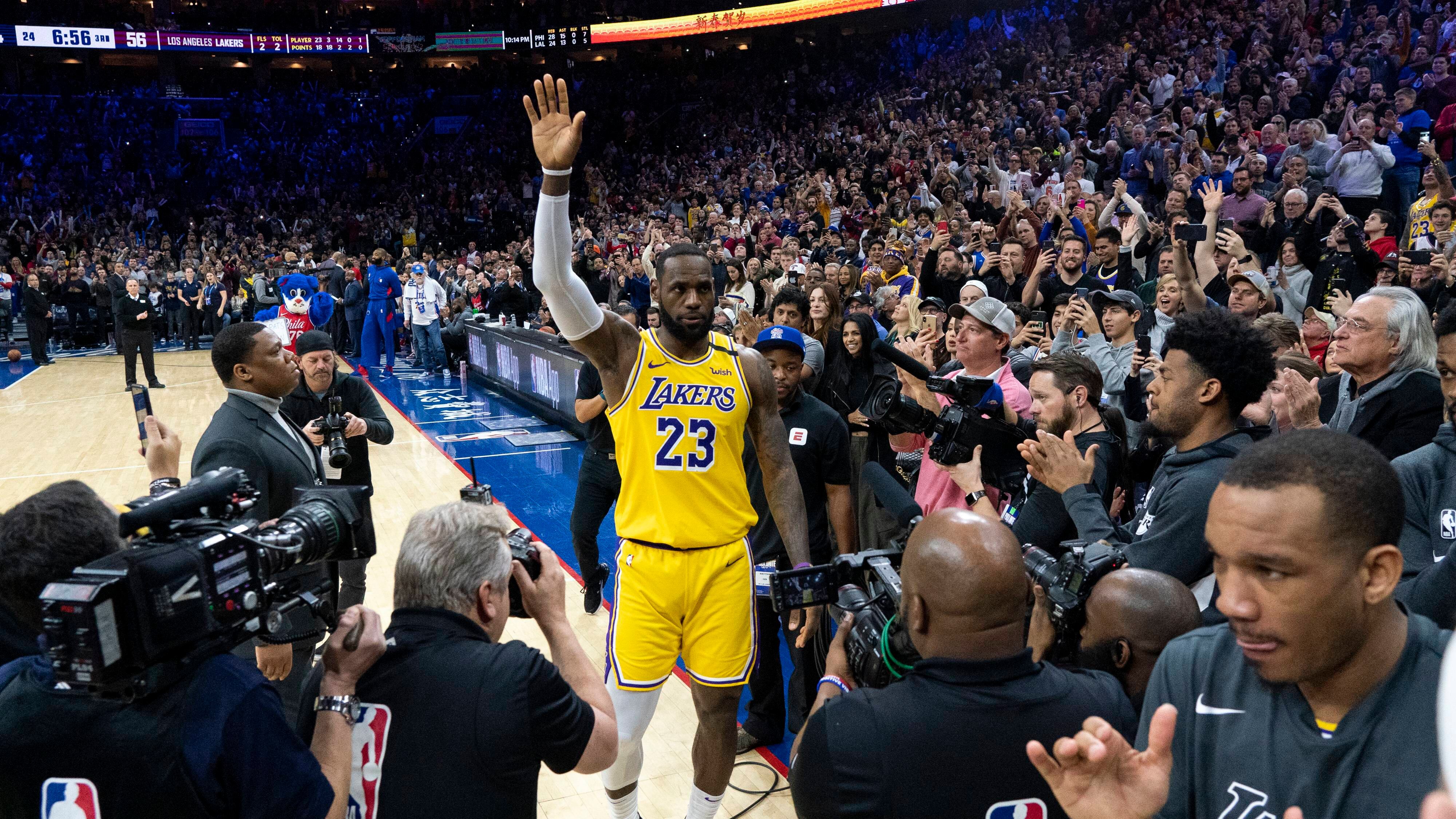 James saludó a los aficionados de Filadelfia que se pusieron de pie para ovacionarle cuando el hito fue anunciado por la megafonía.