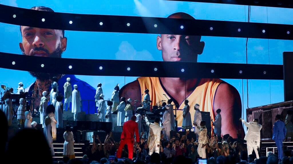 Desde la alfombra roja hasta el escenario principal, la tristeza embargó la noche más importante de la música el domingo en la arena en el centro de Los Angeles donde Kobe Bryant jugó por 20 años para el equipo de la NBA de la ciudad.