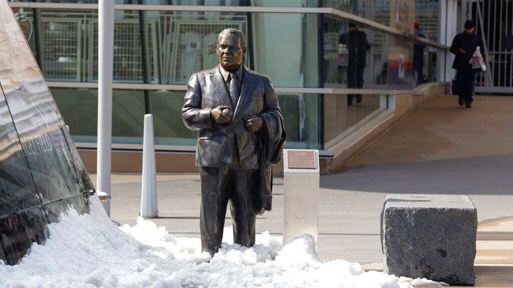 Una estatua del expropietario de los Panthers de Carolina, Jerry Richardson, quien fue acusado en 2017 de hacer insinuaciones sexuales a mujeres y lanzar un insulto racista a un reclutador de raza negra del equipo, fue retirada de su pedestal afuera del estadio la semana pasada.