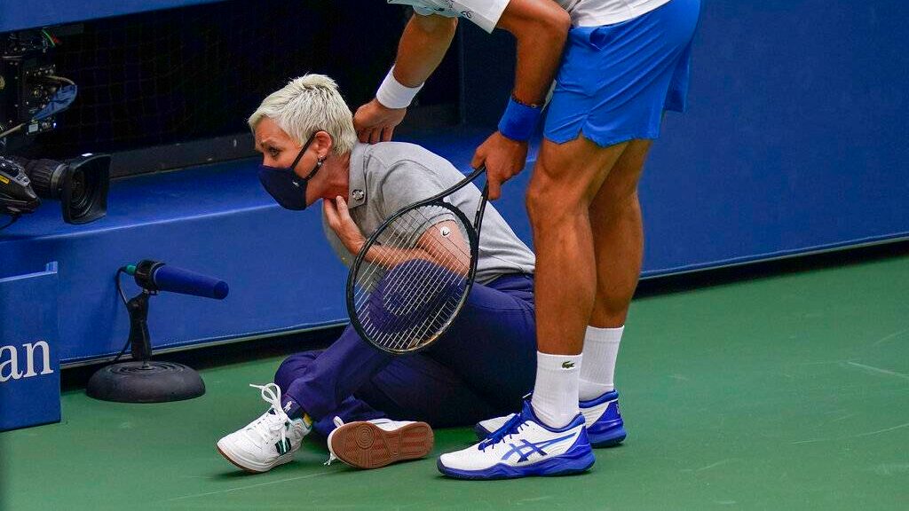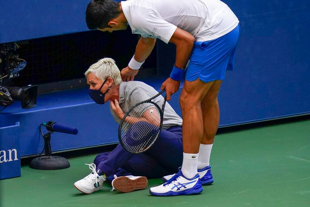 Mientras se dirigía a hacer el cambio de lado de la cancha en el Estadio Arthur Ashe, con una desventaja de 6-5 en el primer set, Djokovic —que llegó al torneo como primer cabeza de serie, el número uno del mundo y amplio favorito para alzar el trofeo— mostró su frustración golpeando una pelota hacia atrás. La pelota impactó a la jueza de línea, quien cayó de rodillas mientras se dolía del cuello.