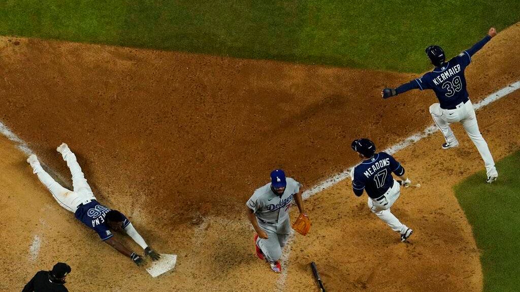 El jardinero central Chris Taylor pifió el batazo de Phillips para un error mientras Kevin Kiermaier anotaba la carrera del empate. Arozarena nunca detuvo su marcha y cayó al suelo en su camino hacia el plato, mucho antes de llegar a la registradora.
