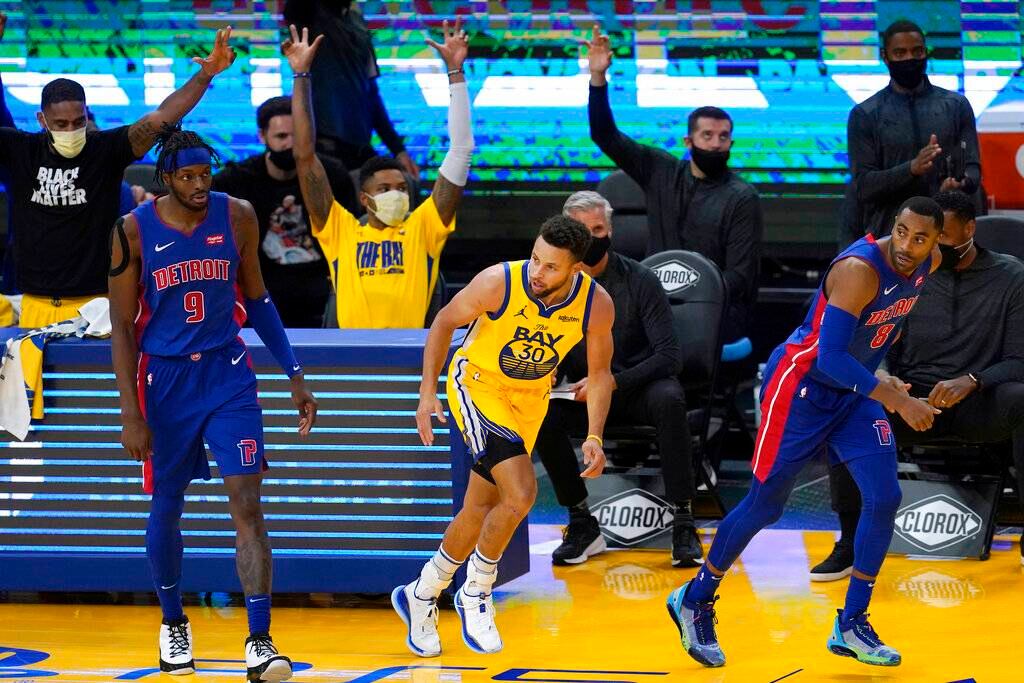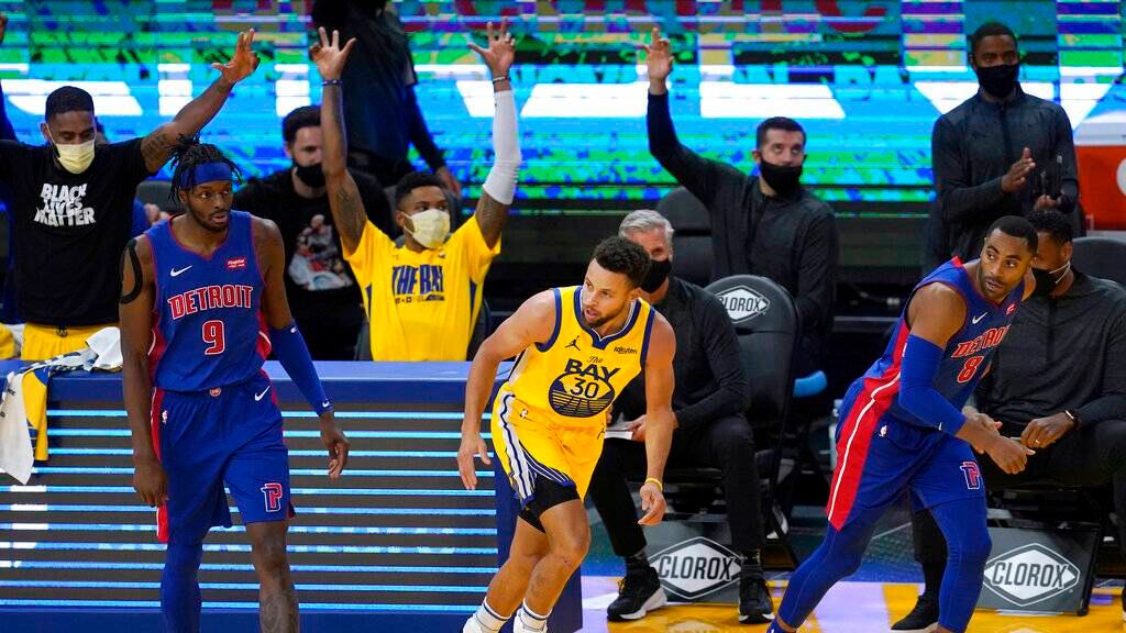 Stephen Curry anotó 28 puntos, al atinar seis triples, y los Warriors de Golden State tomaron la ventaja desde temprano para apabullar el sábado 118-91 a los Pistons de Detroit.