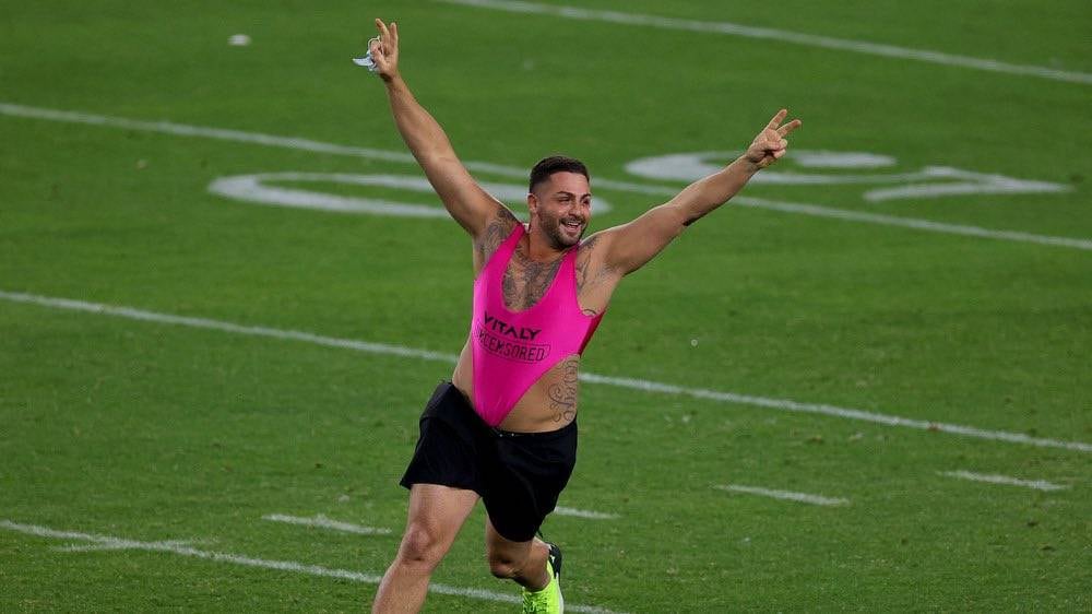 La playera que llevaba el hombre tenía el nombre de una página pornográfica. Por supuesto, esta idea no nació de Andrade, sino del famoso youtuber Vitaly Zdorovetskiy quien reconoció que es la quinta vez que logra que una persona se cuele en el campo de juego durante un Super Bowl.