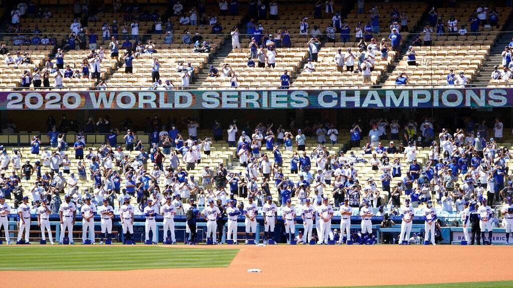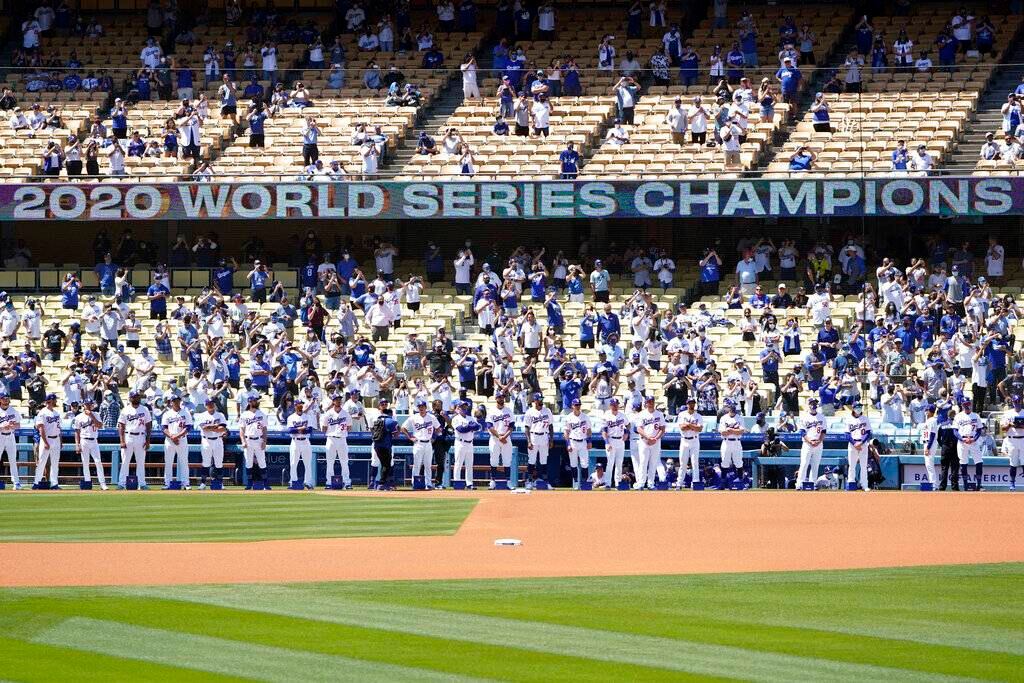 En una ceremonia previa al duelo, los Dodgers recibieron sus anillos de monarcas del Clásico de Otoño. Asistieron algunos fanáticos, que no pudieron atestiguar la campaña anterior, disputada en parque vacíos por la pandemia y que desembocó en la séptima coronación del equipo en la historia.