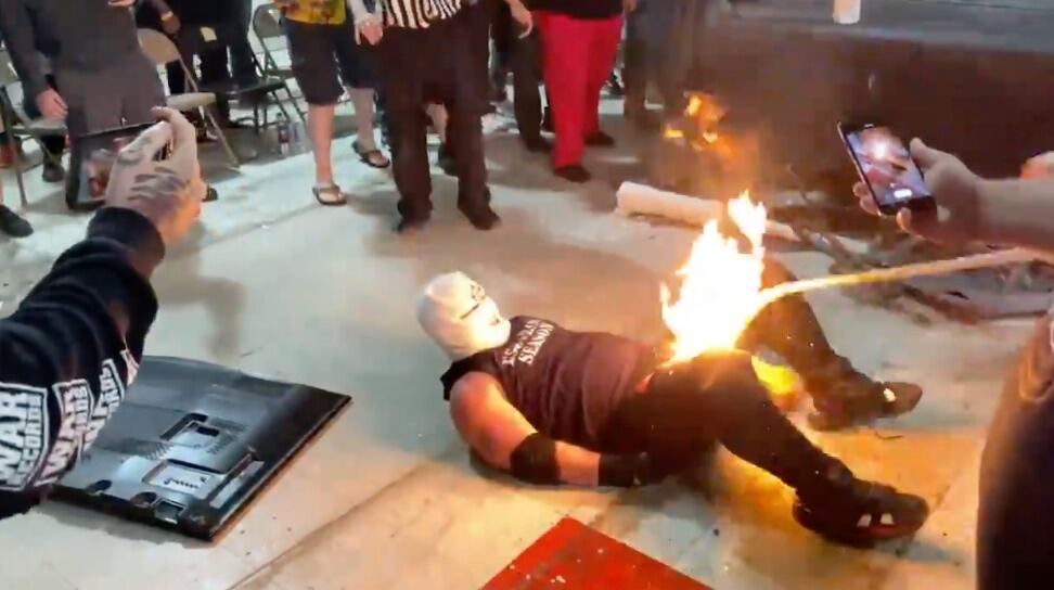 Eric Ryan, como parte del espectáculo, llenó a su rival de gasolina, para después prenderlo con fuego. El show se salió de control, cuando su colega realmente se estaba incendiando, por lo que intentó quitarse inmediatamente las prendas que traía puestas.
