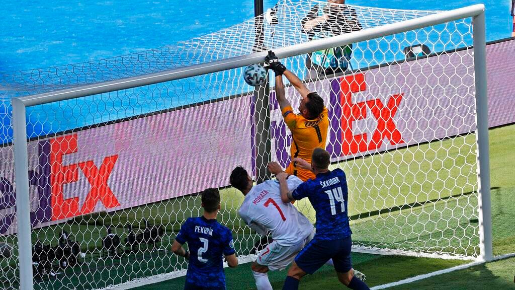 El partido no empezó bien para los españoles, que habían empatado sus dos primeras presentaciones y corrían peligro de quedar afuera. Dominaban pero no concretaban las situaciones que creaban. Para colmo el portero Martin Dúbravka atajó un penal de Álvaro Morata a los 12 minutos.