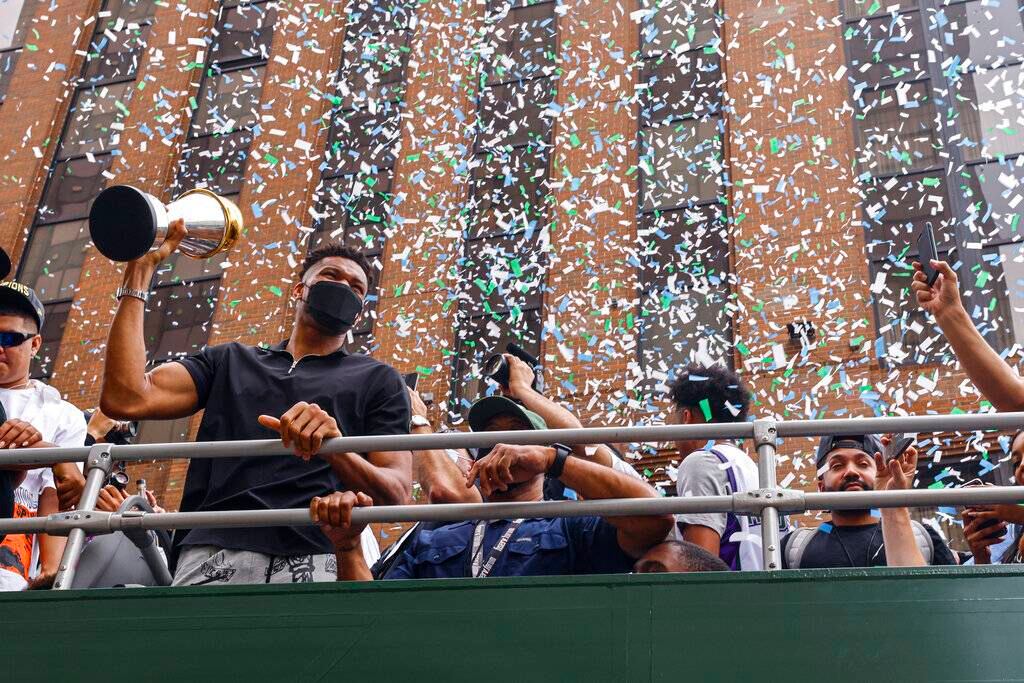 Seis policías montados a caballo encabezaron una procesión que incluyó un camión de bomberos que avanzaba sonando el claxon, y autobuses de dos pisos sin techo y camiones con plataforma en que viajaban las estrellas de los Bucks —entre ellas el Jugador Más Valioso de las Finales de la NBA, Giannis Antetokounmpo, y Jrue Holiday, así como el trofeo que obtuvieron la noche del martes con una victoria sobre los Suns de Phoenix en el sexto partido de la serie.
