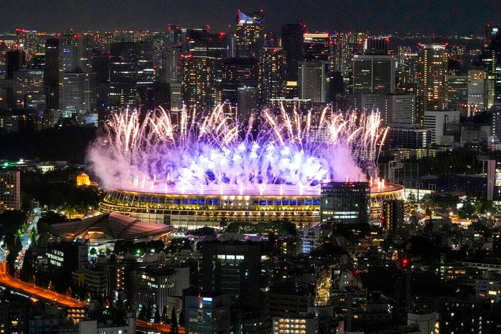 Un luz azul cubrió sobre las gradas vacías y la música a todo volumen enmudeció los gritos de manifestantes afuera del recinto que clamaban por la cancelación de los Juegos — un sentimiento fuerte en el país. Fuegos artificiales iluminaron el cielo. En forma de octágono, la tarima evocó el emblemático Monte Fuji.