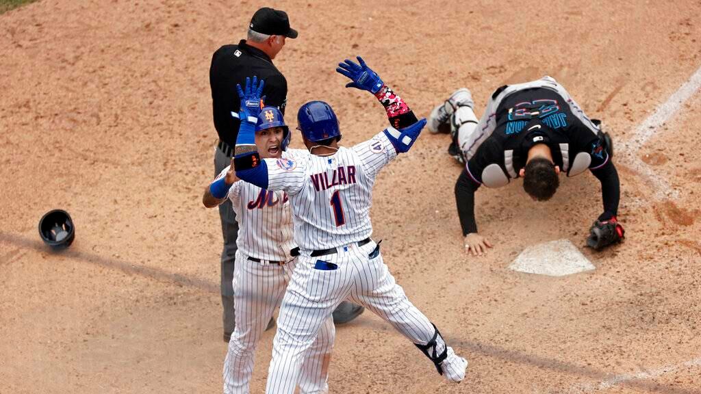 Javier Báez corrió hacia home desde la inicial para anotar la carrera que puso fin al juego en un sencillo de Michael Conforto, y los Mets de Nueva York superaron el martes 6-5 a los Marlins de Miami.