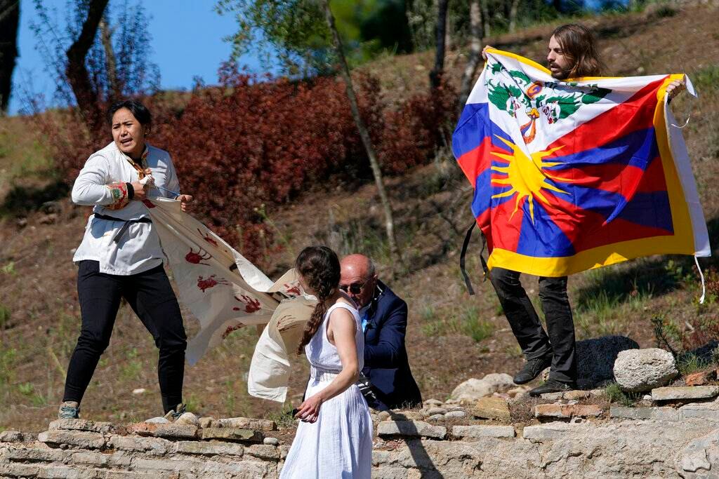 Tres activistas que denunciaban abusos de derechos humanos en China irrumpieron el lunes en el complejo arqueológico donde se celebraba la ceremonia de encendido de la llama olímpica para los Juegos de Invierno de 2022, acercándose hacia la antorcha con un bandera tibetana y una pancarta que decía “No a los juegos del genocidio”.