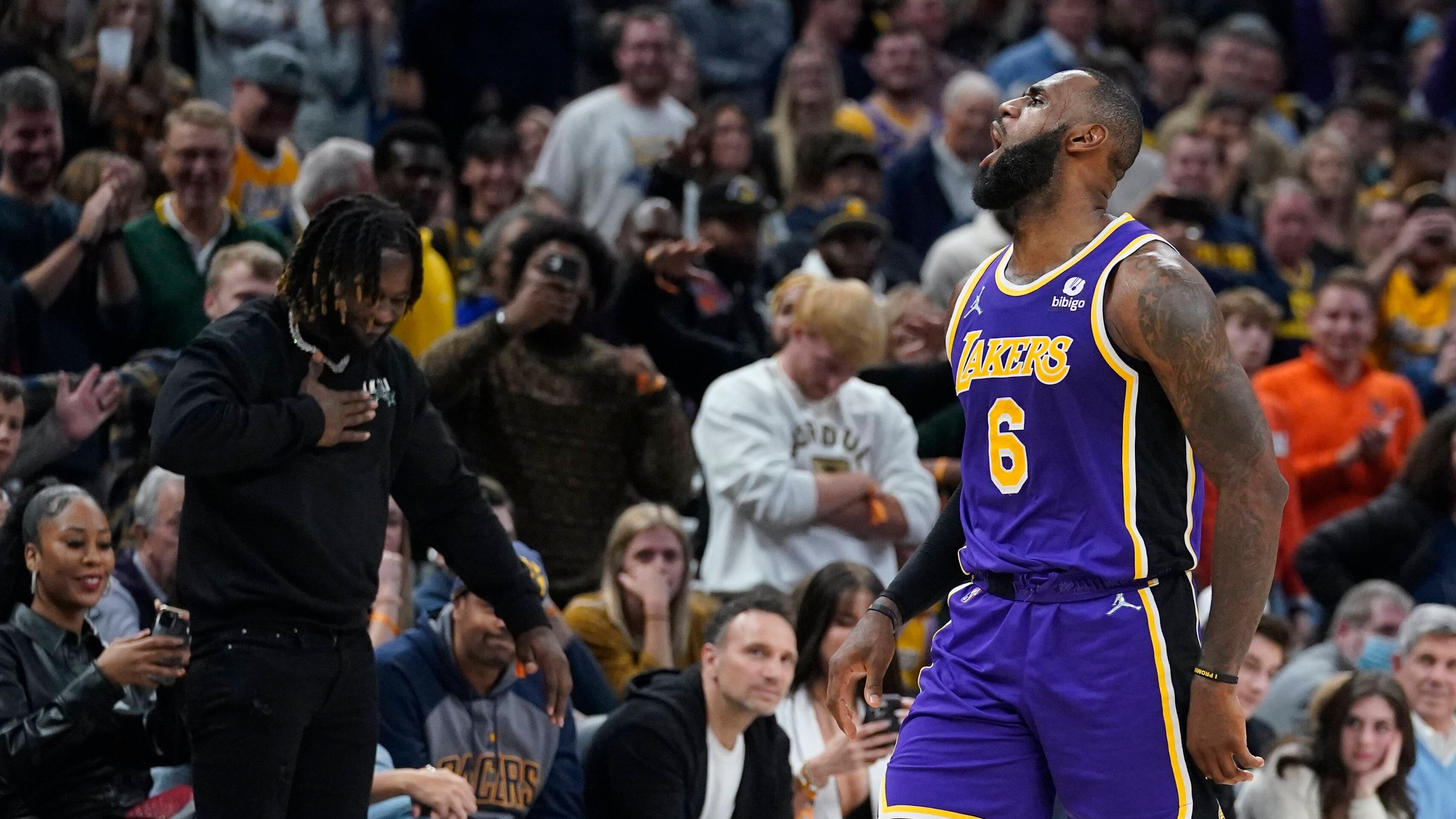 El superastro de los Lakers de Los Ángeles hizo el gesto después de efectuar un lanzamiento casi al final del partido que su equipo ganó de visitante en tiempo extra a Indiana por 124-116 el miércoles en la noche.