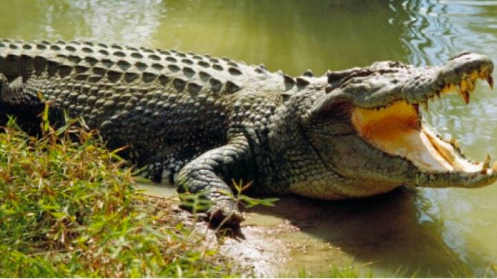 El cocodrilo observaba pacientemente hasta que decide salir del agua y caminar hacia donde se celebra el banquete. Al ver la presencia del reptil, los perros salvajes huyen del lugar corriendo.