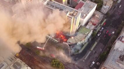Las imágenes aéreas muestran la gran humareda negra que desprende el incendio y a efectivos de bomberos intentando extinguir las llamas. También muestra a la policía dispersando a los manifestantes con cañones de agua.