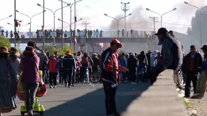 Las imágenes muestran a manifestantes con banderas Wiphala reunidos en el lugar y bloqueando el camino con barricadas en llamas.