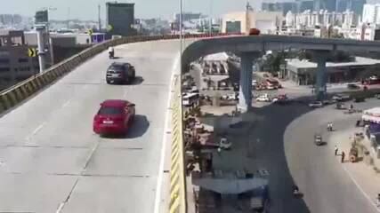Las cámaras de vigilancia captaron el preciso instante en que el auto, de color rojo, transita a alta velocidad por una carretera elevada y pierde el control al doblar por una pronunciada curva.