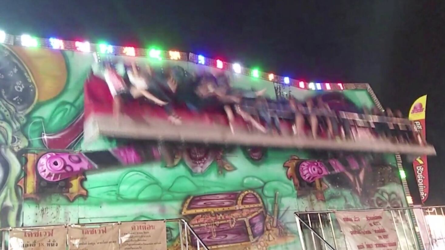 Catorce personas se apiñaron en el paseo de estilo ’cliffhanger’ en el carnaval en Lopburi, Tailandia central, el sábado por la noche alrededor de las 9 p.m. hora local, y después de dar varias vueltas, la barra de metal que los sujetaba se soltó, causando la caída de los tripulantes.