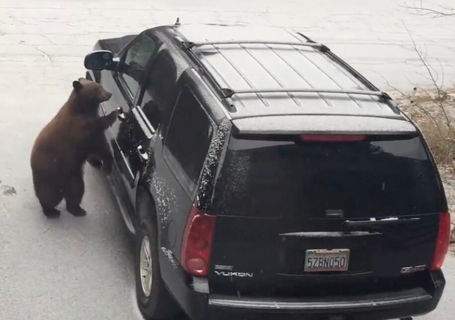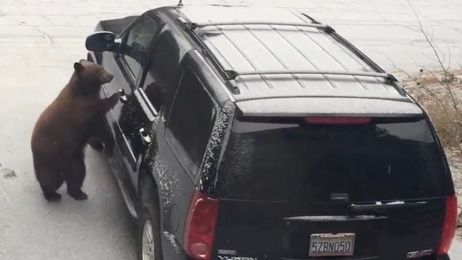 El hombre lo intentó una vez y no le funcionó, luego de varios intentos pudo abrir la puerta y el oso a los segundos salió de la camioneta y emprendió la huida.
