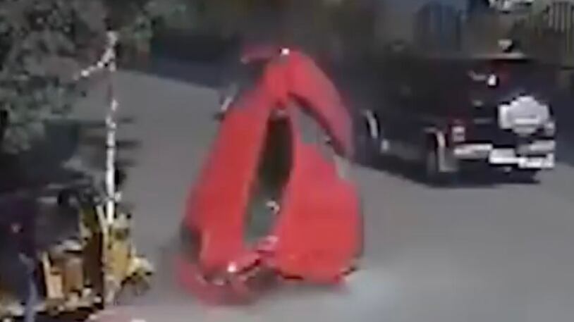 En el video grabado por una cámara de seguridad se ve el momento exacto en el que el carro toma una de las curvas a gran velocidad y choca contra la barrera del puente, por el impulso que llevaba siguió derecho y cayó a una calle donde personas transitaban con normalidad.