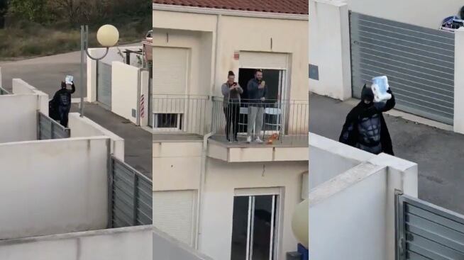 Por supuesto se trata tan sólo de una broma de un tipo que, aburrido en casa por el aislamiento, ha decidido sacar su disfraz y pasear por las calles animando a los vecinos, y de paso a las redes sociales con un poco de humor.