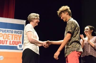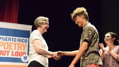 Andi Mathis, la representante del National Endowment for the Arts, presentó al estudiante ganador de la competencia estatal de Poetry Out Loud PR, Matías Coss Hernández, quien manifestó “que la poesía es viable como modo de expresión de sufrimiento y alegría de un pueblo. La poesía es una manera preciosa de manisfestar la cultura. Para mí este certamen ha sido un ejercicio artístico”.