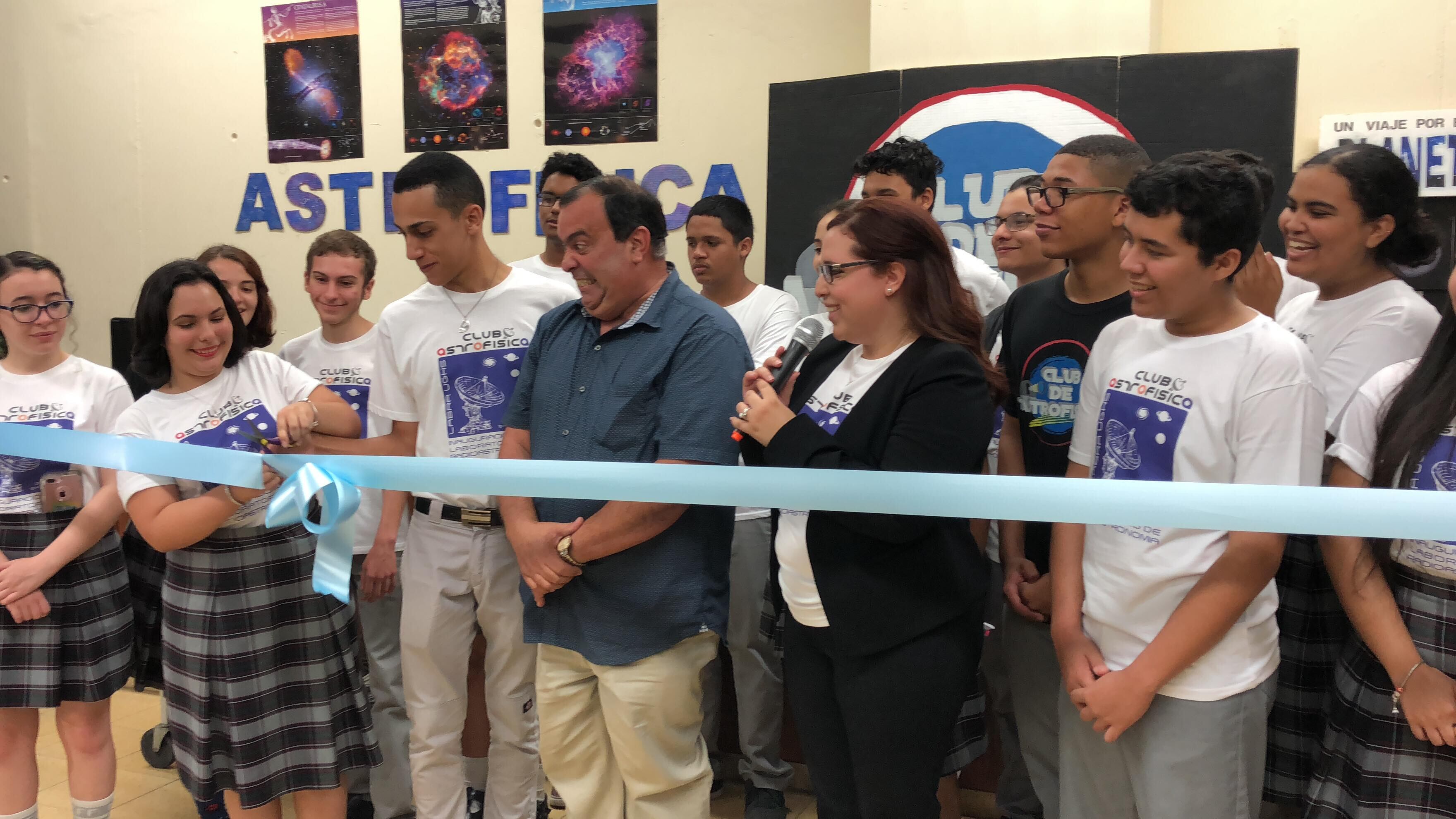La maestra, el presidente del Club de Astrofísica, Airam Acevedo, la vicepresidenta Enid Fernández Guzmán, y los demás miembros del Club, realizaron el corte de cinta en el salón B-301, luego de celebrar un evento de inauguración que contó con varios invitados especiales de la Universidad de Puerto Rico, la Sociedad Astronómica y el Departamento de Educación.