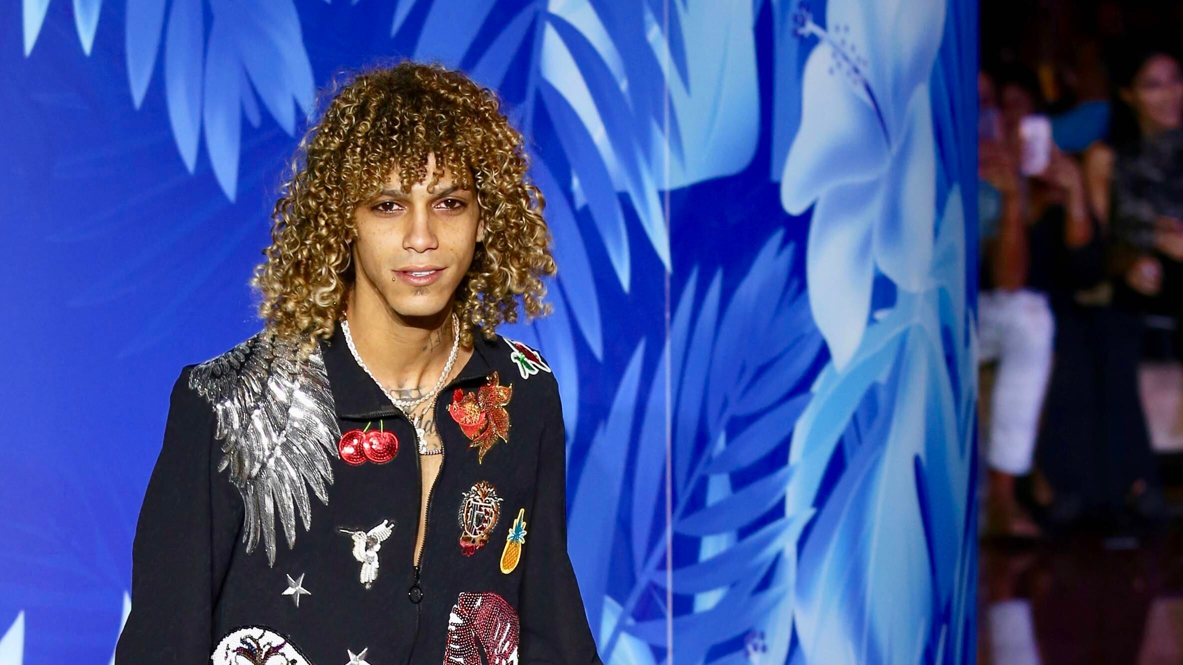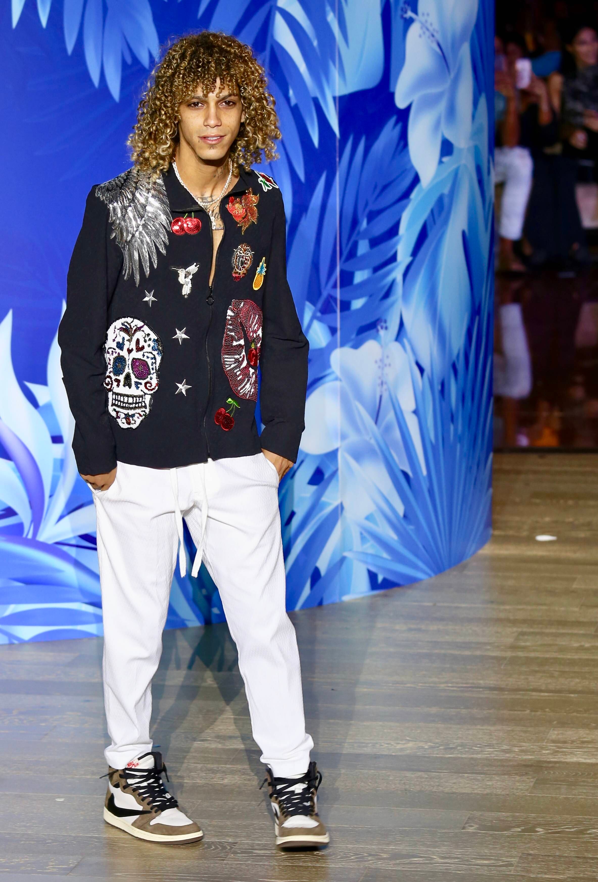Sin duda, uno de los más aplaudidos y que mayor soltura desplegó en la pasarela fue el rapero y productor Jon Z, quien vistió pantalón blanco con un vistoso jacket negro bordado con símbolos en lentejuelas, caravelas, labios, alas de angel y estrellas, de la colección “Oversize” del diseñador puertorriqueño David Antonio.